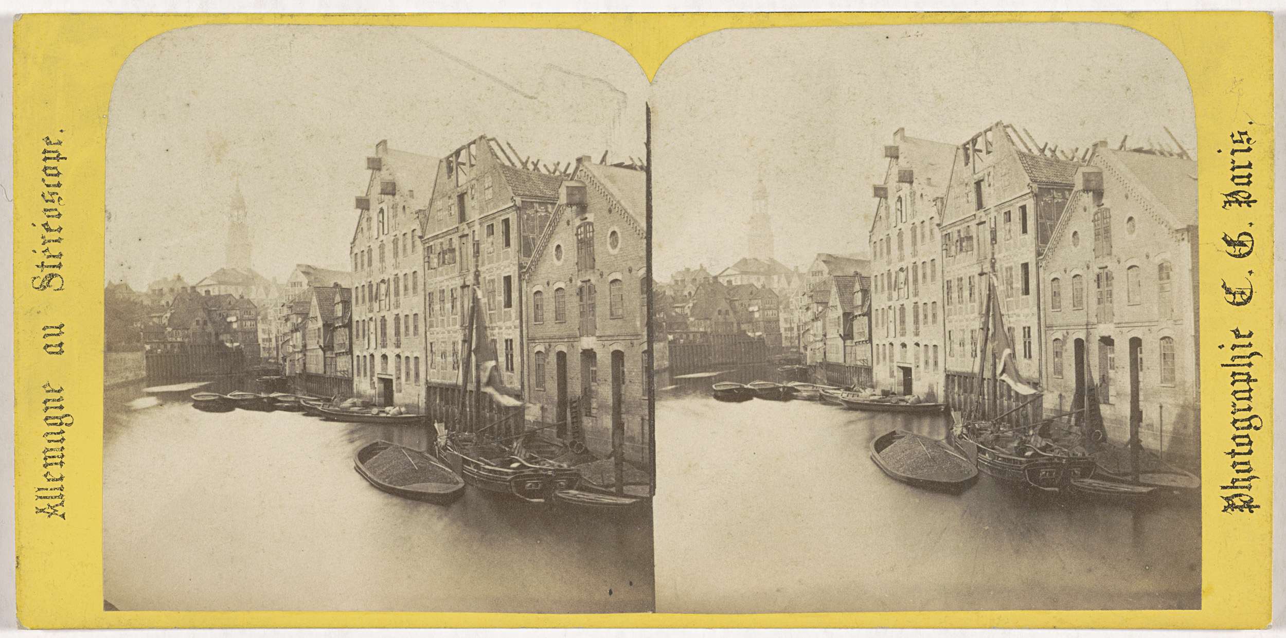 Pakhuizen aan de Bleichenfleet en de toren van de Sint-Michielskerk in Hamburg, Duitsland