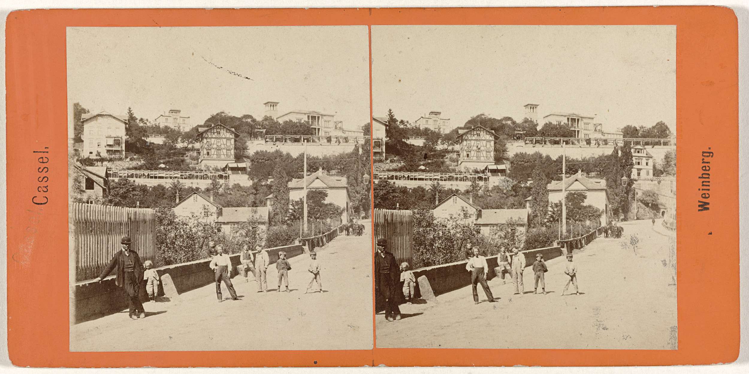 Mannen en jongens op straat in Kassel met op de achtergrond de Weinberg
