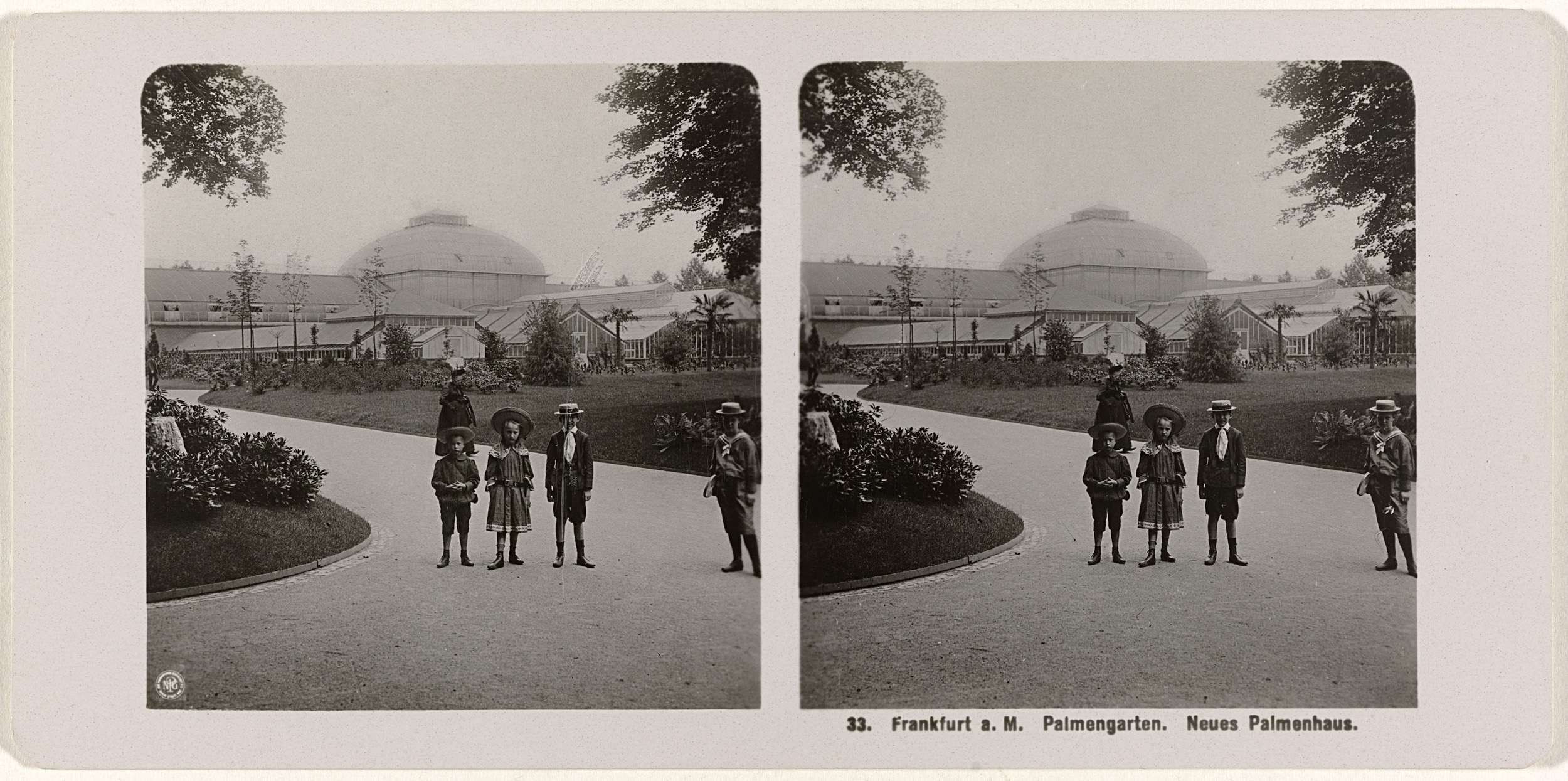 Kinderen voor het palmenhuis in de Palmentuin van Frankfurt am Main