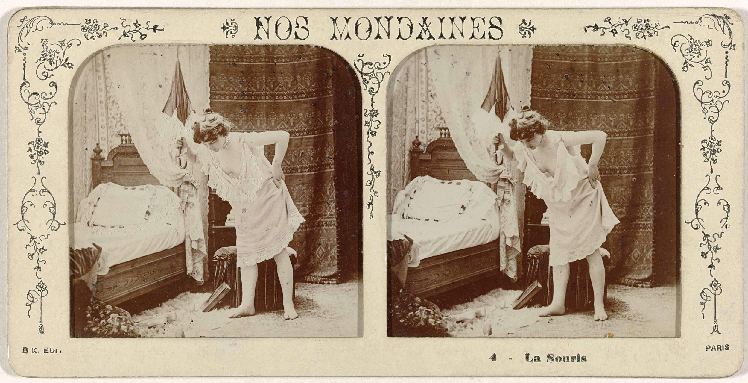 Schaars geklede vrouw staat naast bed en zoekt een muis op de vloer