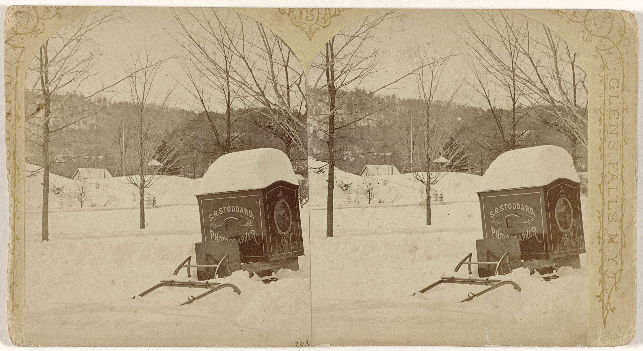Wagen van fotograaf Seneca Ray Stoddard in een sneeuwlandschap, Verenigde Staten