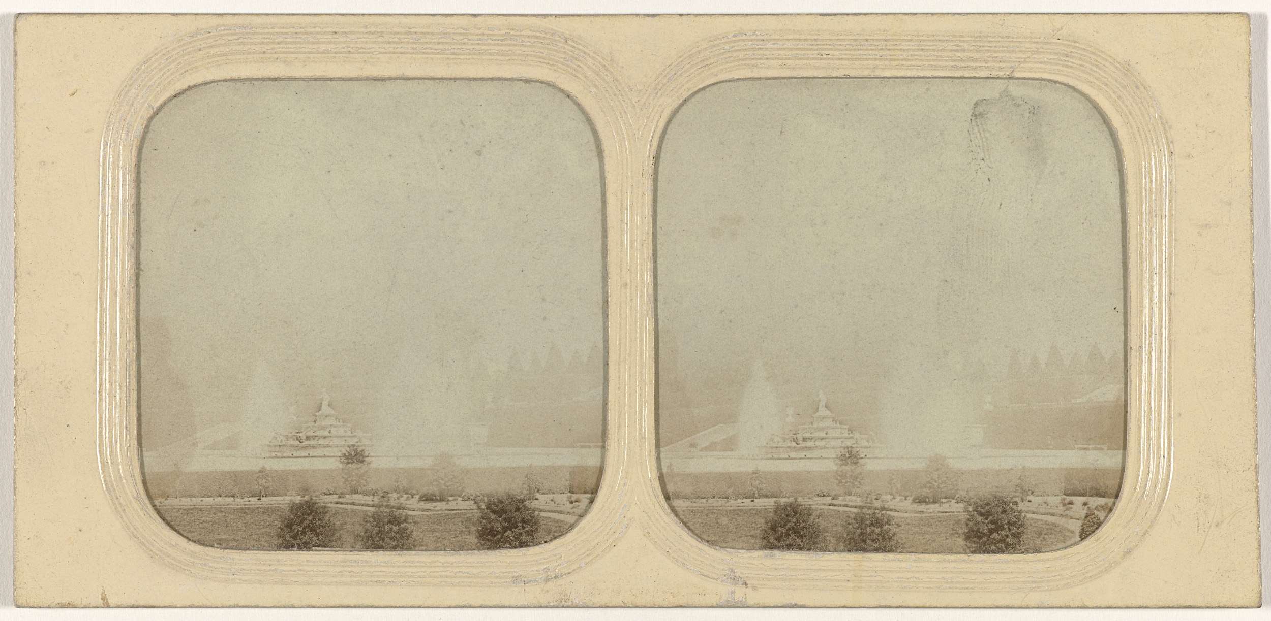Gezicht op de tuin van Versailles met daarachter een gezelschap in een salon