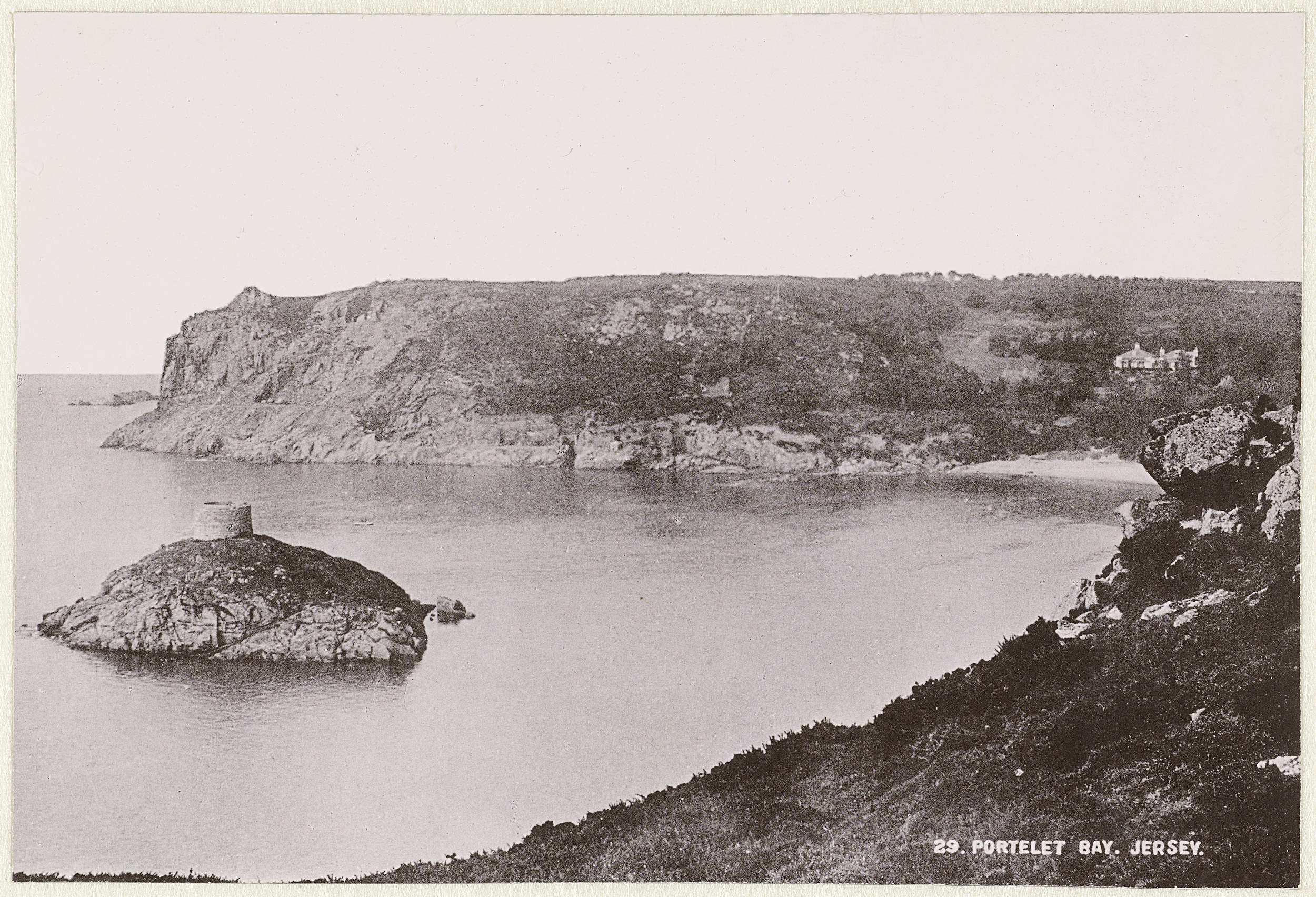 Gezicht op Portelet Bay op Jersey met links de toren van Janvrin