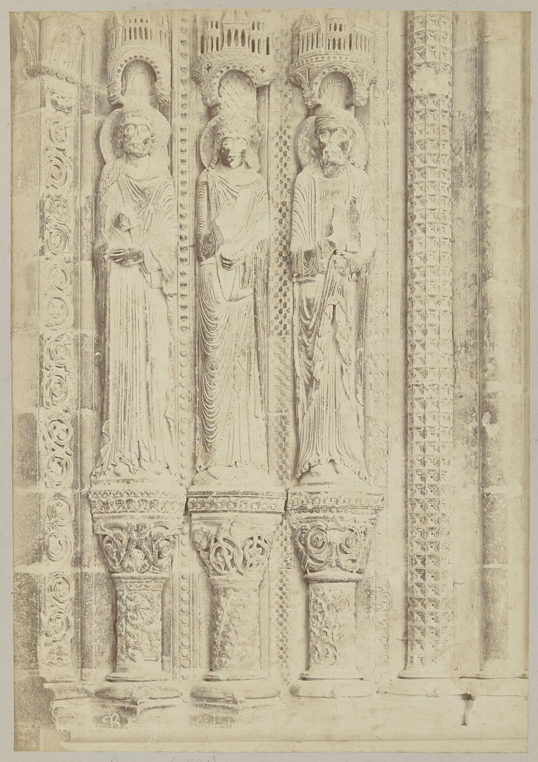 Drie beeldhouwwerken van heiligen in de kathedraal van Bourges