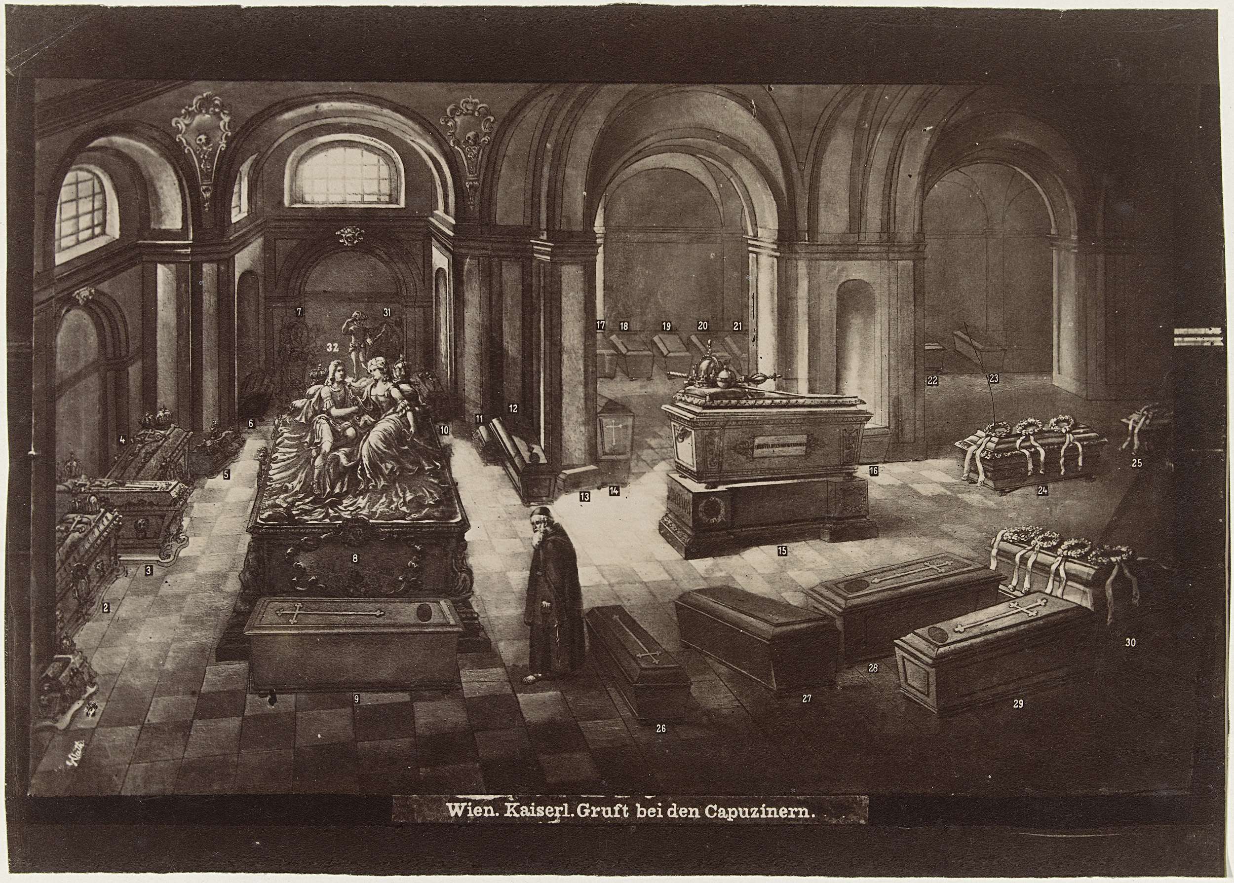 Fotoreproductie van een tekening van de keizerlijke grafkelder onder de Kapucijnerkerk in Wenen, Oostenrijk