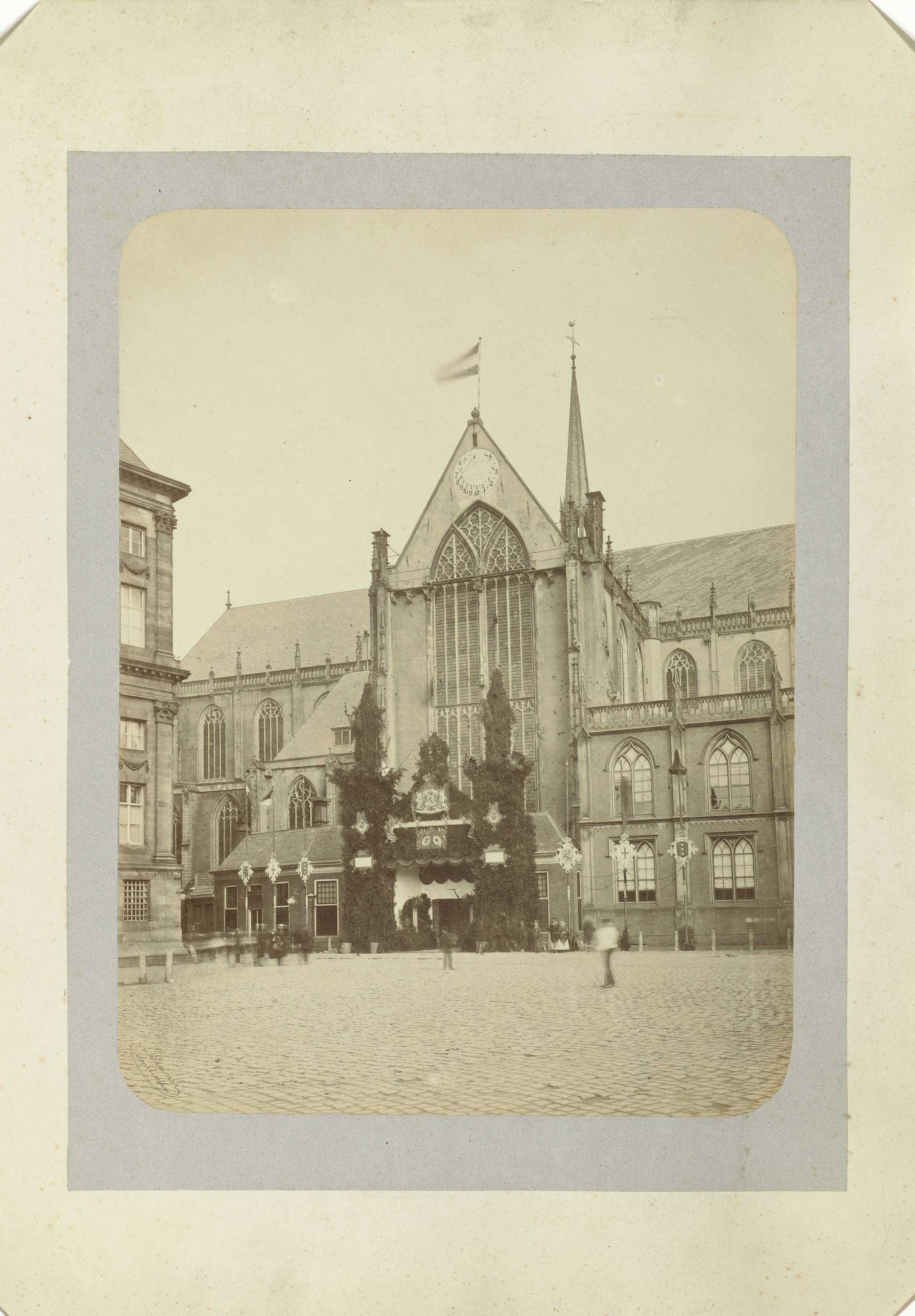 Decoratie aan de buitenkant van de Nieuwe kerk bij de ontvangst van Willem III en Emma in Amsterdam