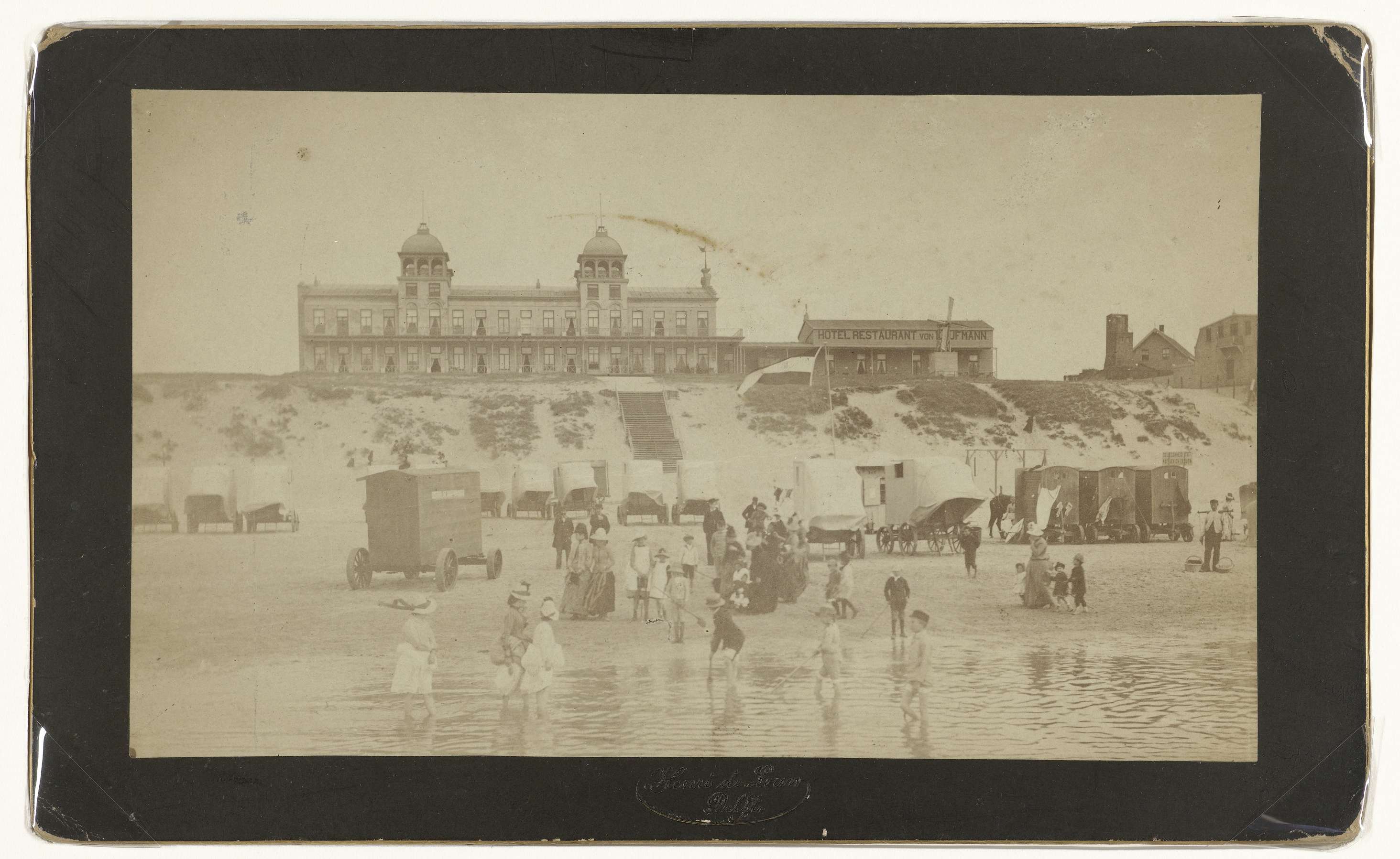 Het strand bij Zandvoort, met baders en badkoetsen en op de achtergrond Hotel Restaurant Kaufmann