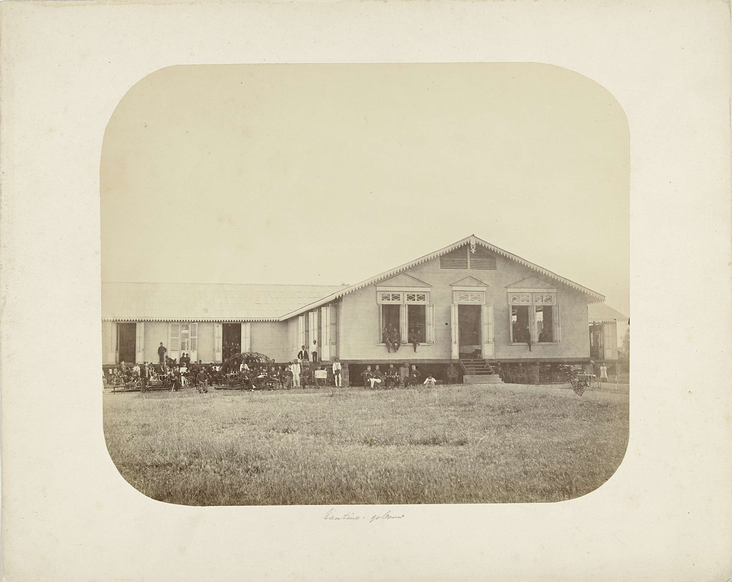 Groep militairen bij een kantinegebouw, Nederlands-Indië