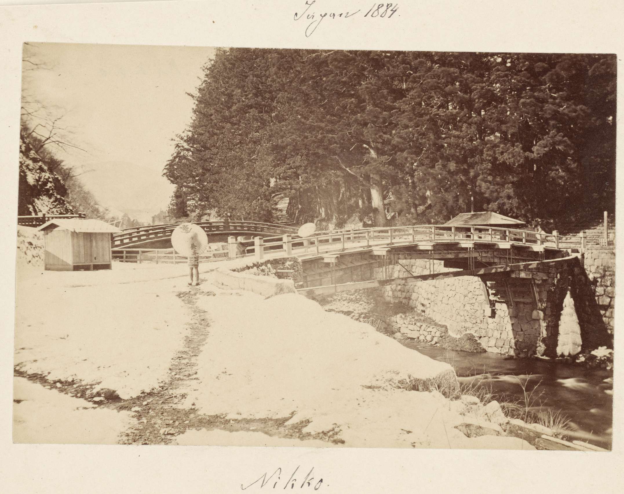 Gezicht op twee bruggen over een rivier in Nikko, Japan