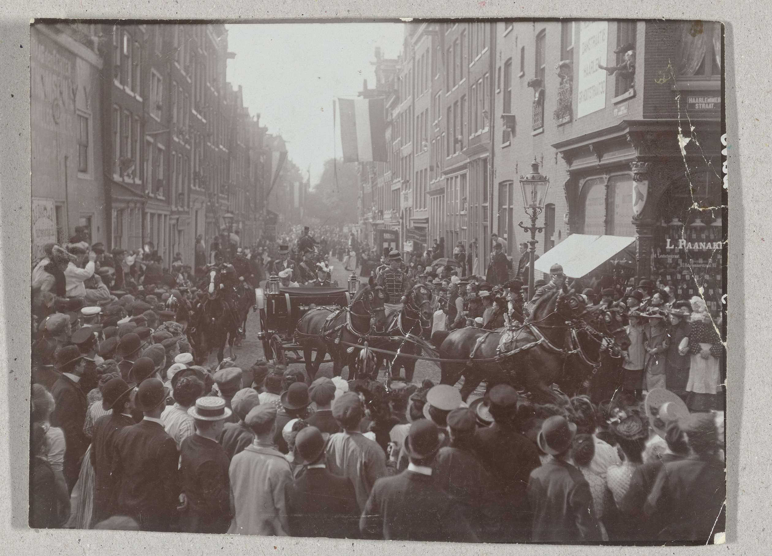 Het rijtuig met koningin Wilhelmina en prins Hendrik draait vanuit de Binnen Brouwersstraat de Haarlemmerstraat op. Langs de route staan toeschouwers. Rechts op de hoek een schoenenwinkel van L. Paanakker.