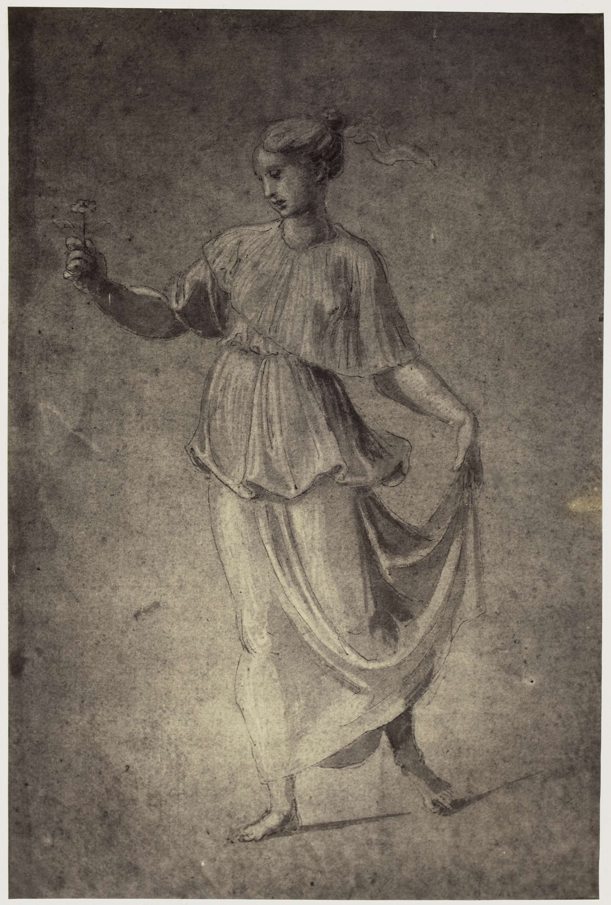Fotoreproductie van een tekening van Rafaël, staande jonge vrouw met bloem