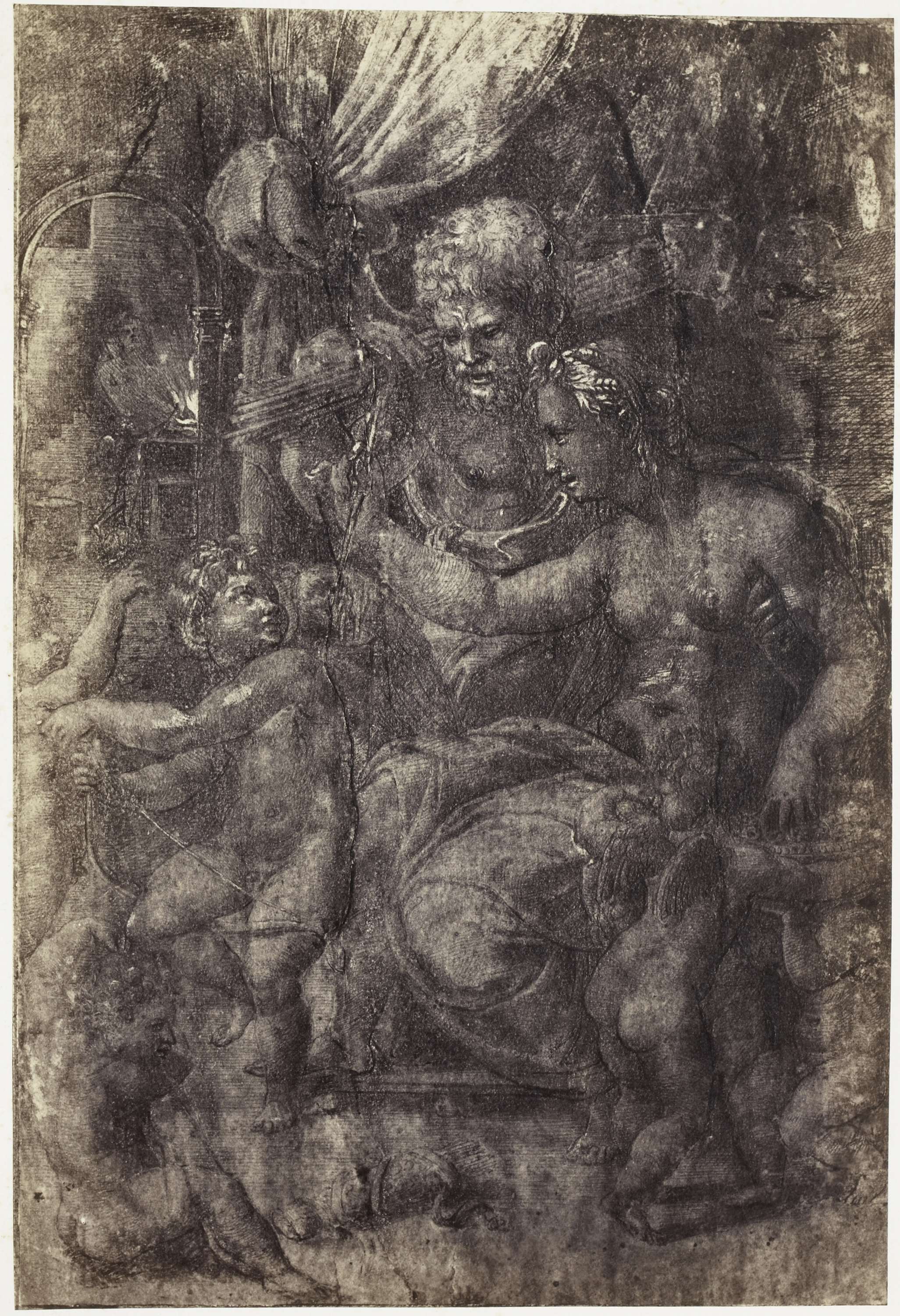 Fotoreproductie van een tekening van Rafaël, Heilige Familie met engelen