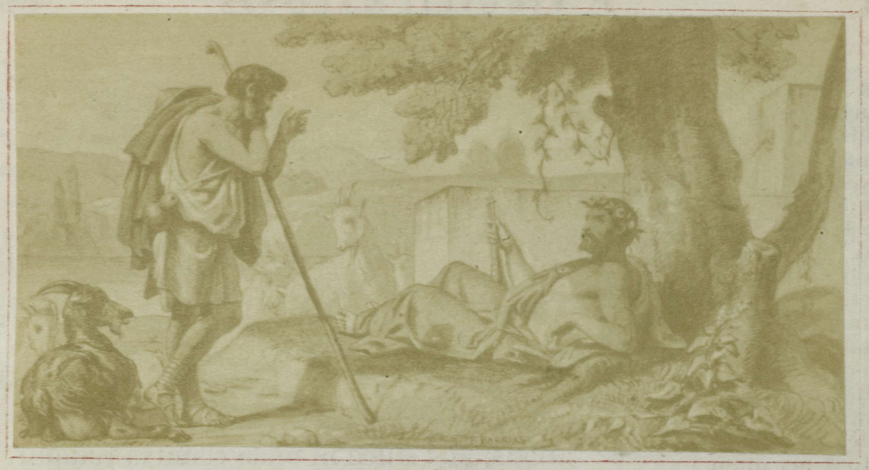 Fotoreproductie van een schilderij van Meliboeus en Tityrus, scène uit Virgilius' Bucolica