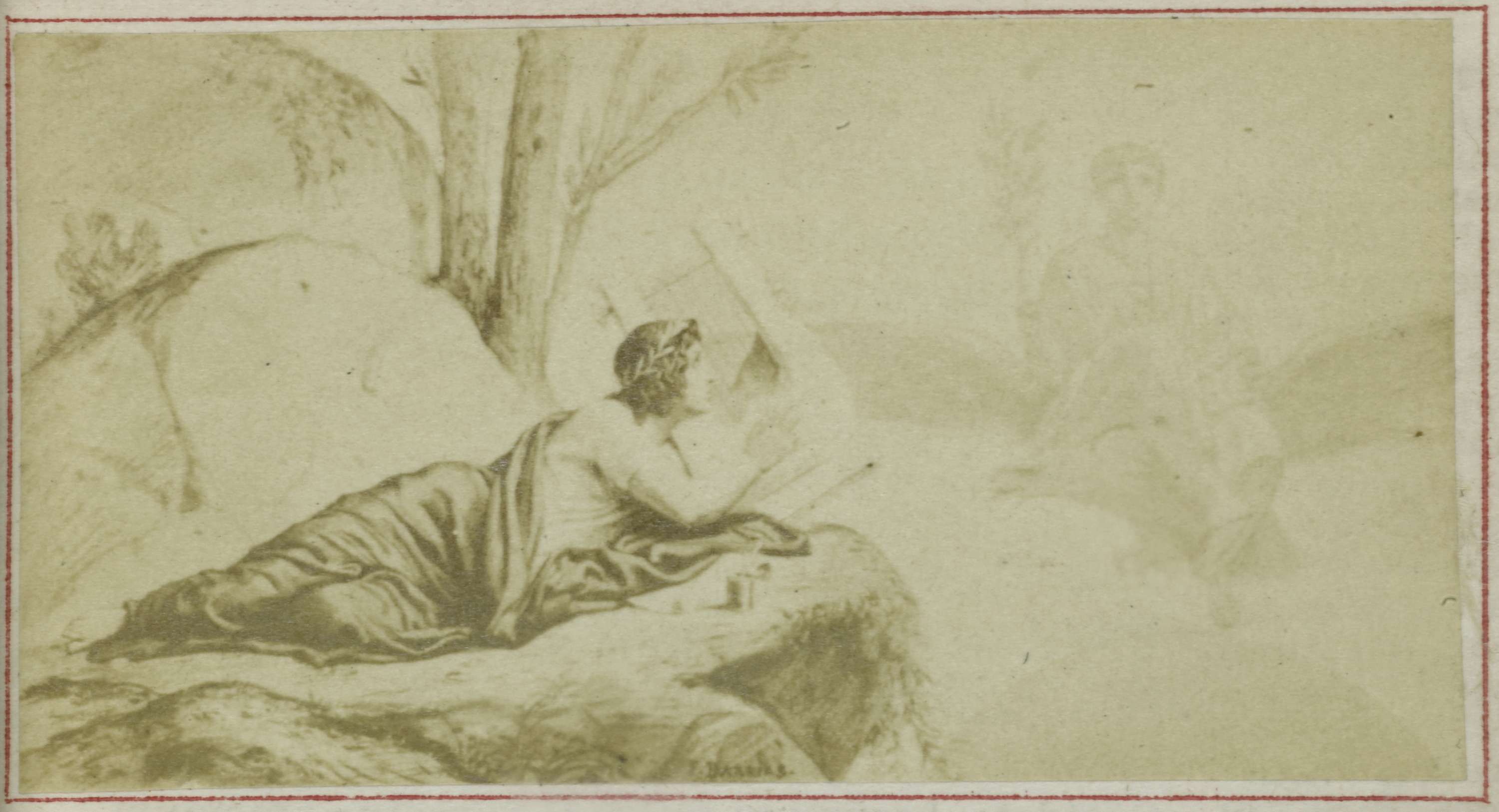 Fotoreproductie van een schilderij, voorstellende (vermoedelijk) Vergilius met een lier en de schim van Gaius Asinius Pollio I, scène uit Virgilius' Bucolica