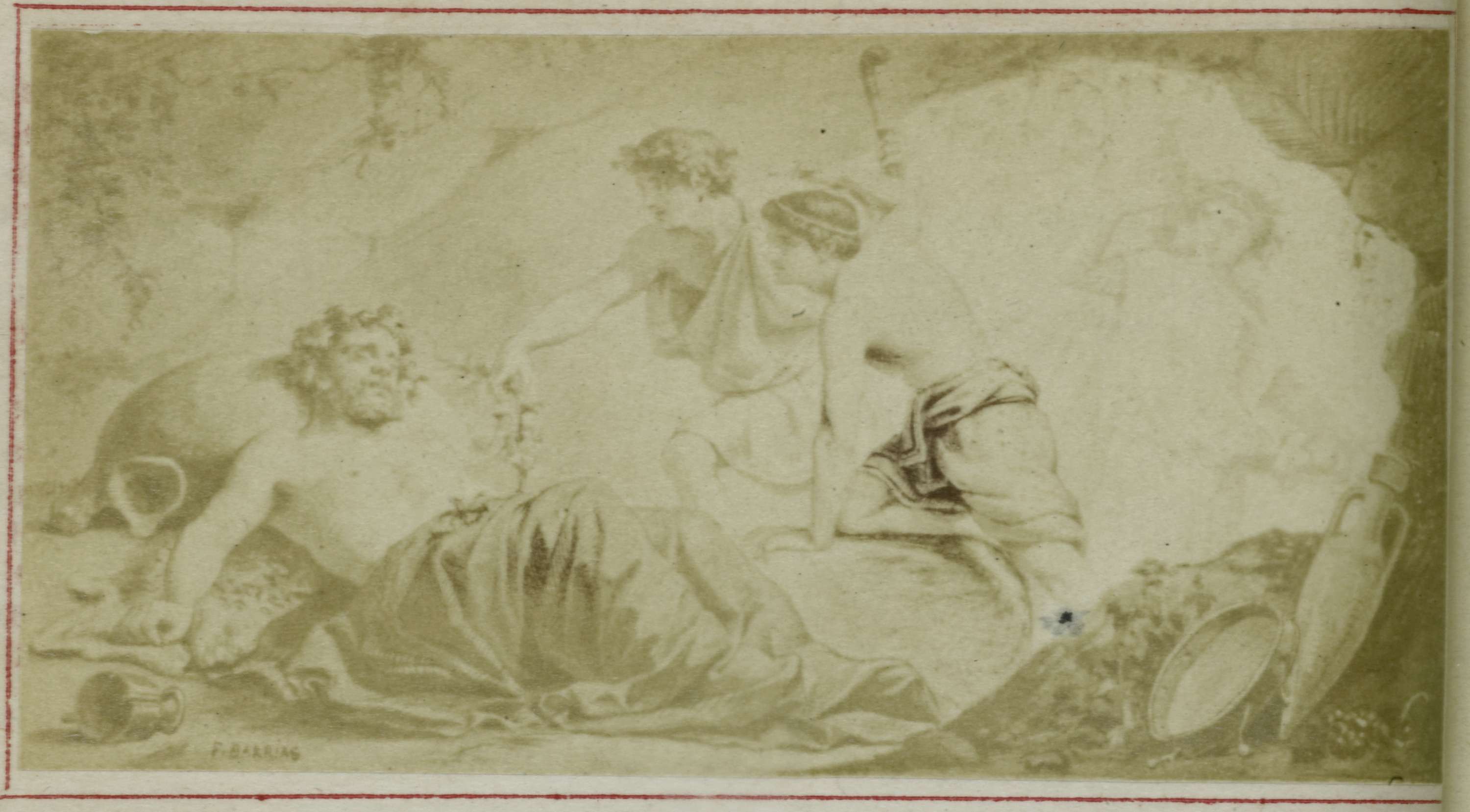 Fotoreproductie van een schilderij van Silenus en drie herders, scène uit Virgilius' Bucolica
