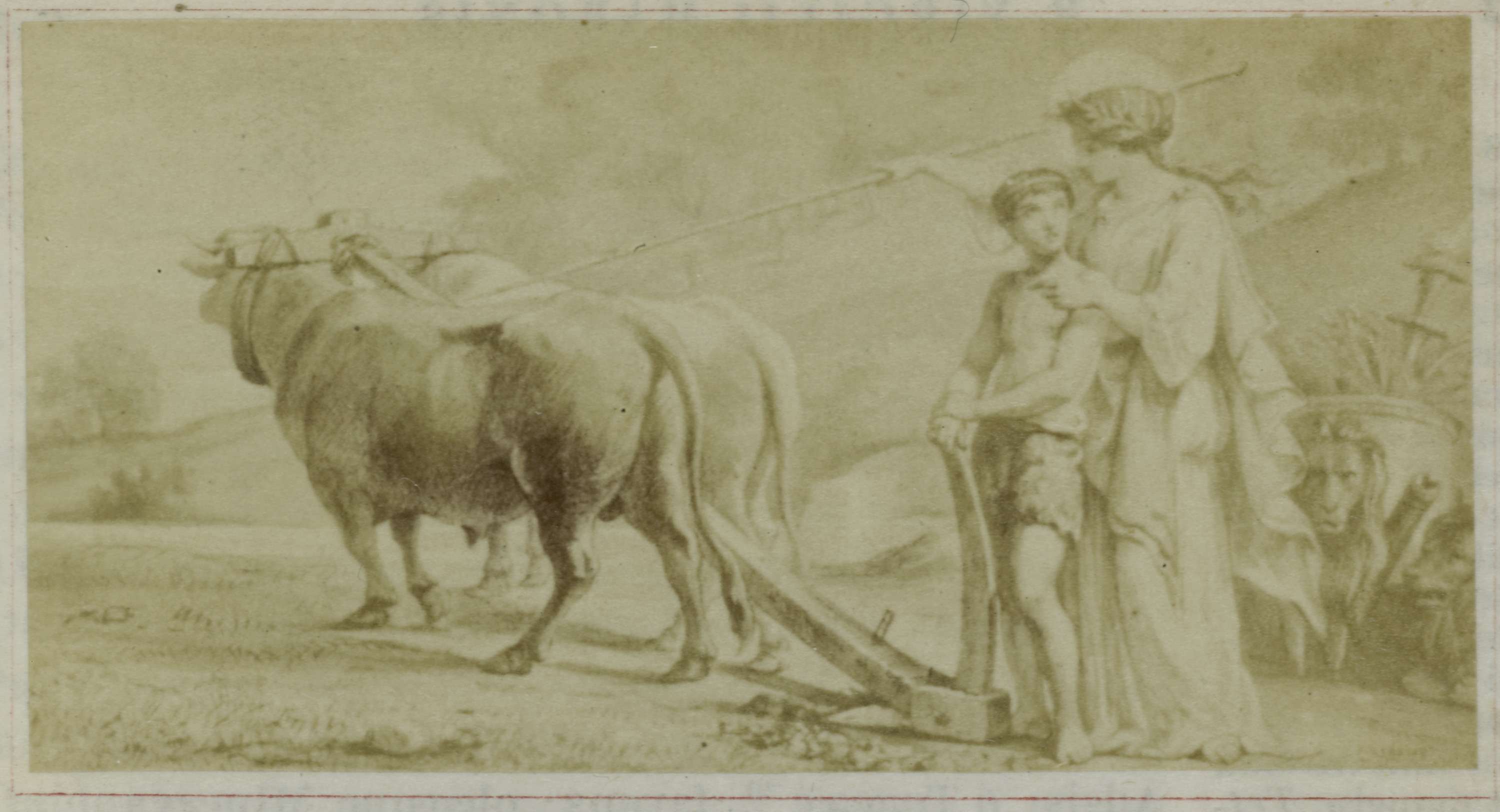 Fotoreproductie van een schilderij van (vermoedelijk) Cybele en een jongen achter een ploeg, scène uit Virgilius' Georgica