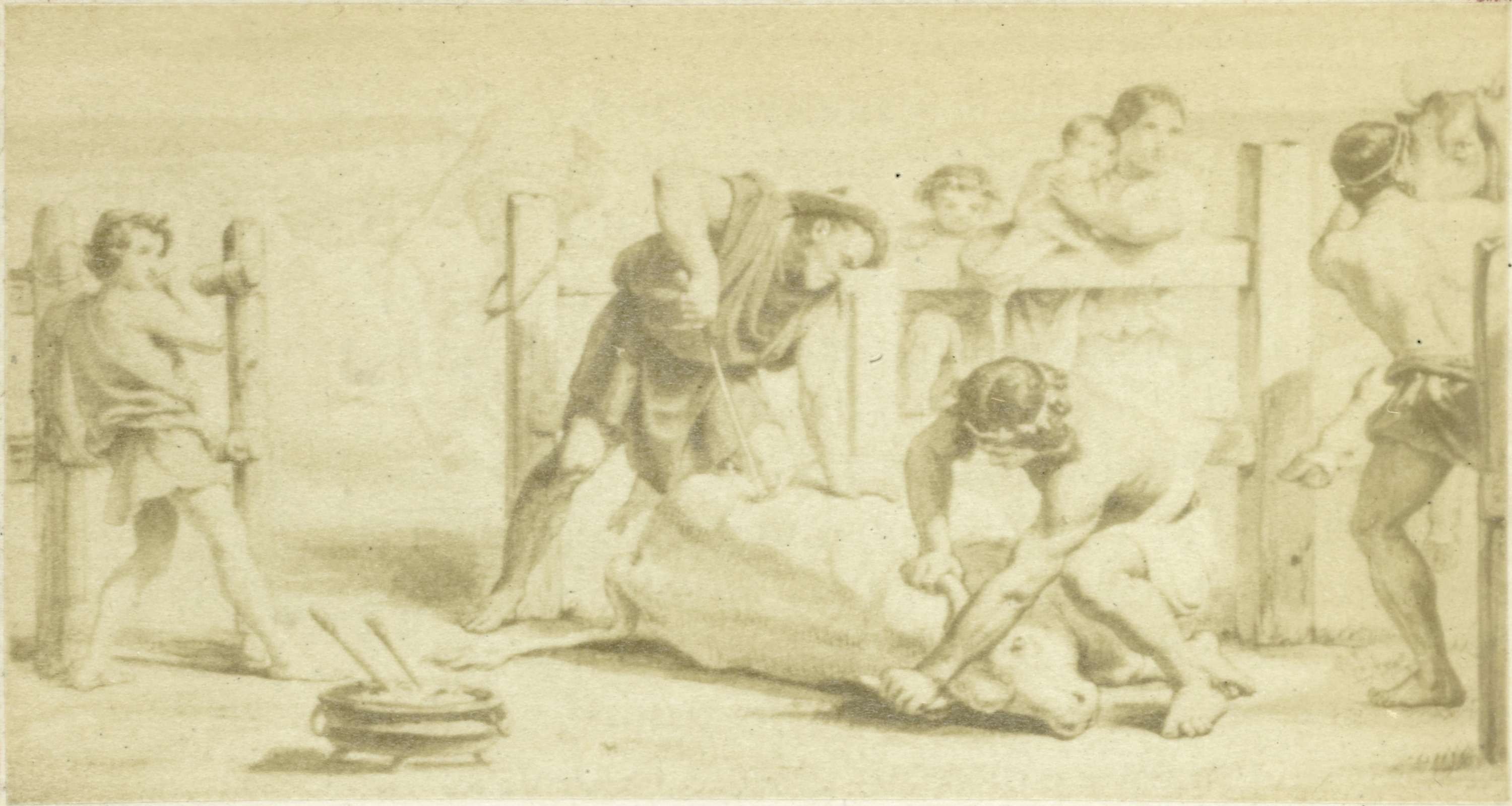 Fotoreproductie van een schilderij van de slacht van een os, scène uit Virgilius' Georgica