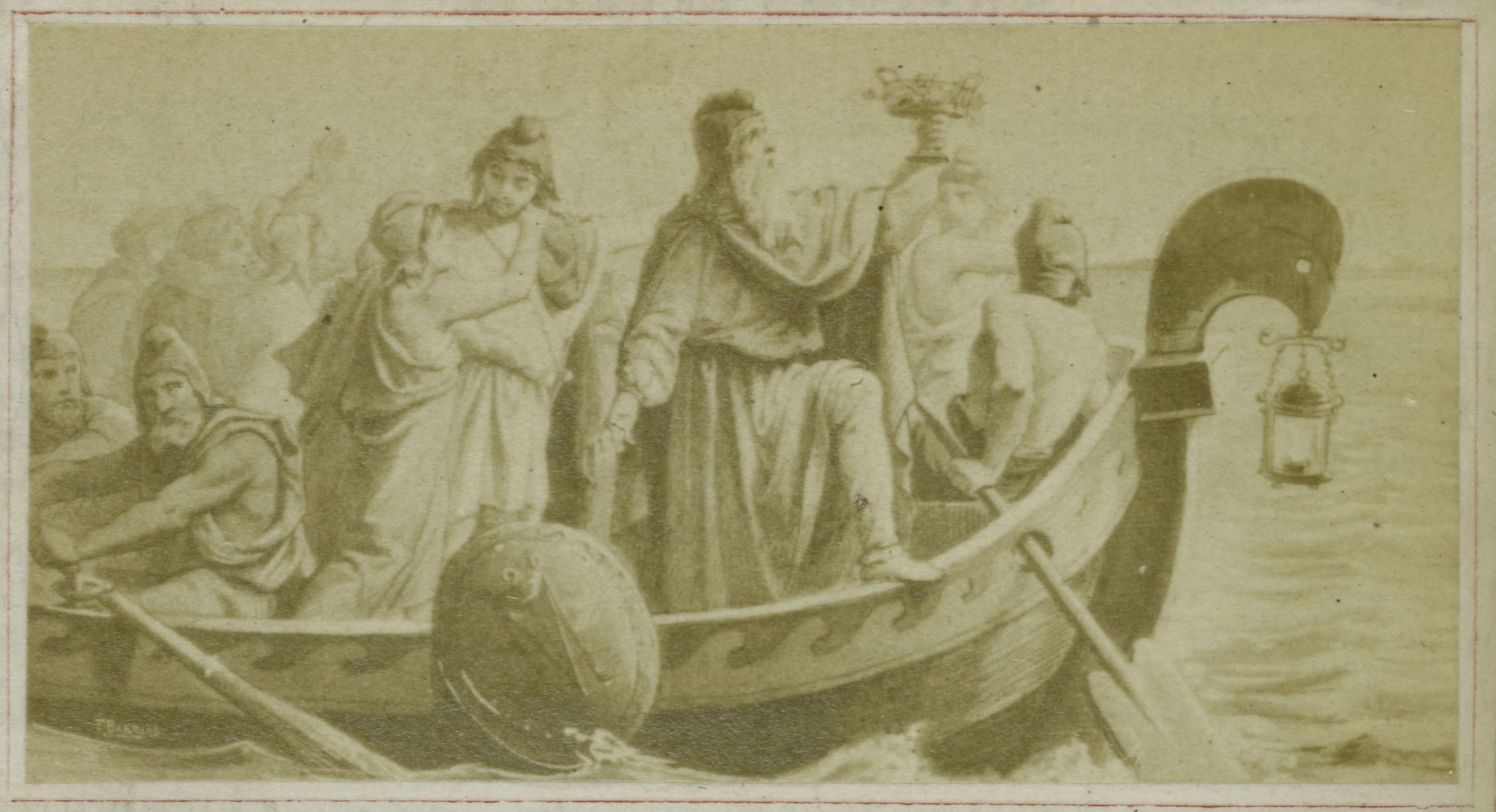 Fotoreproductie van een schilderij, voorstellende Aeneas en Ascanius vluchten met een boot uit Troje, scène uit Virgilius' Aeneis