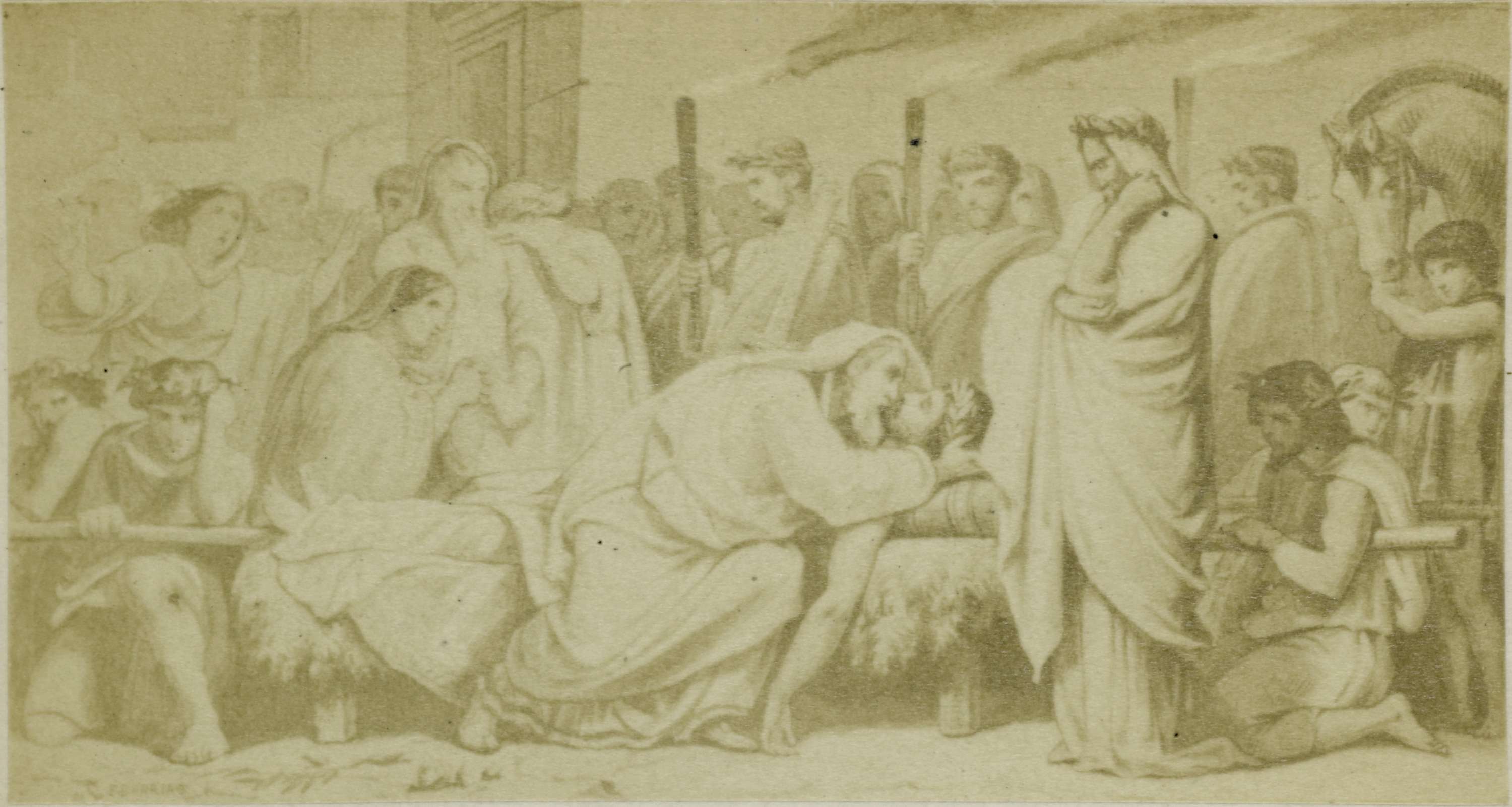Fotoreproductie van een schilderij, voorstellende koning Evander beweent het lijk van Pallas, scène uit Virgilius' Aeneis
