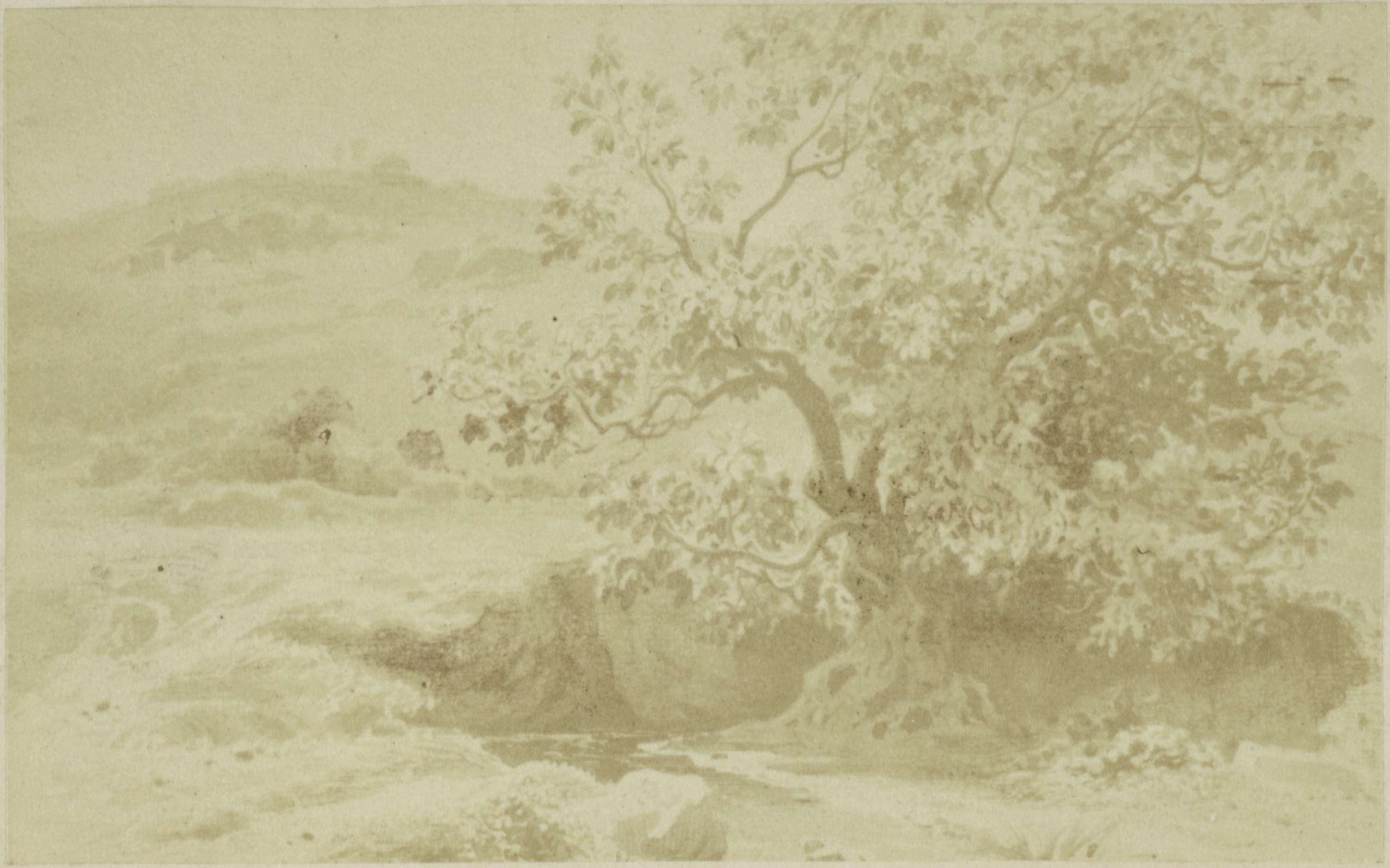 Fotoreproductie van een illustratie van een landschap te Fontaine de L'Orantini