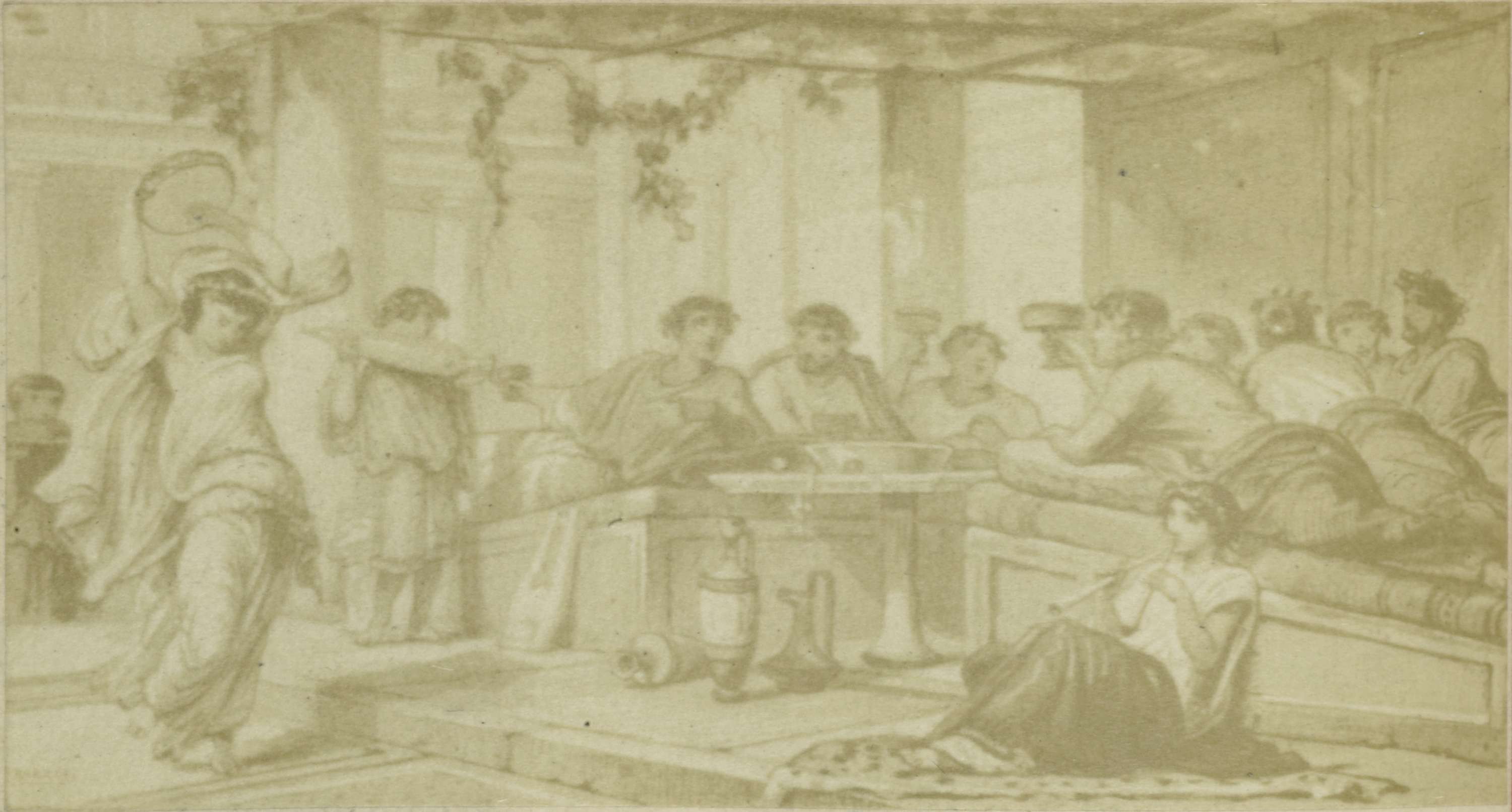Fotoreproductie van een illustratie van een banket met muzikanten
