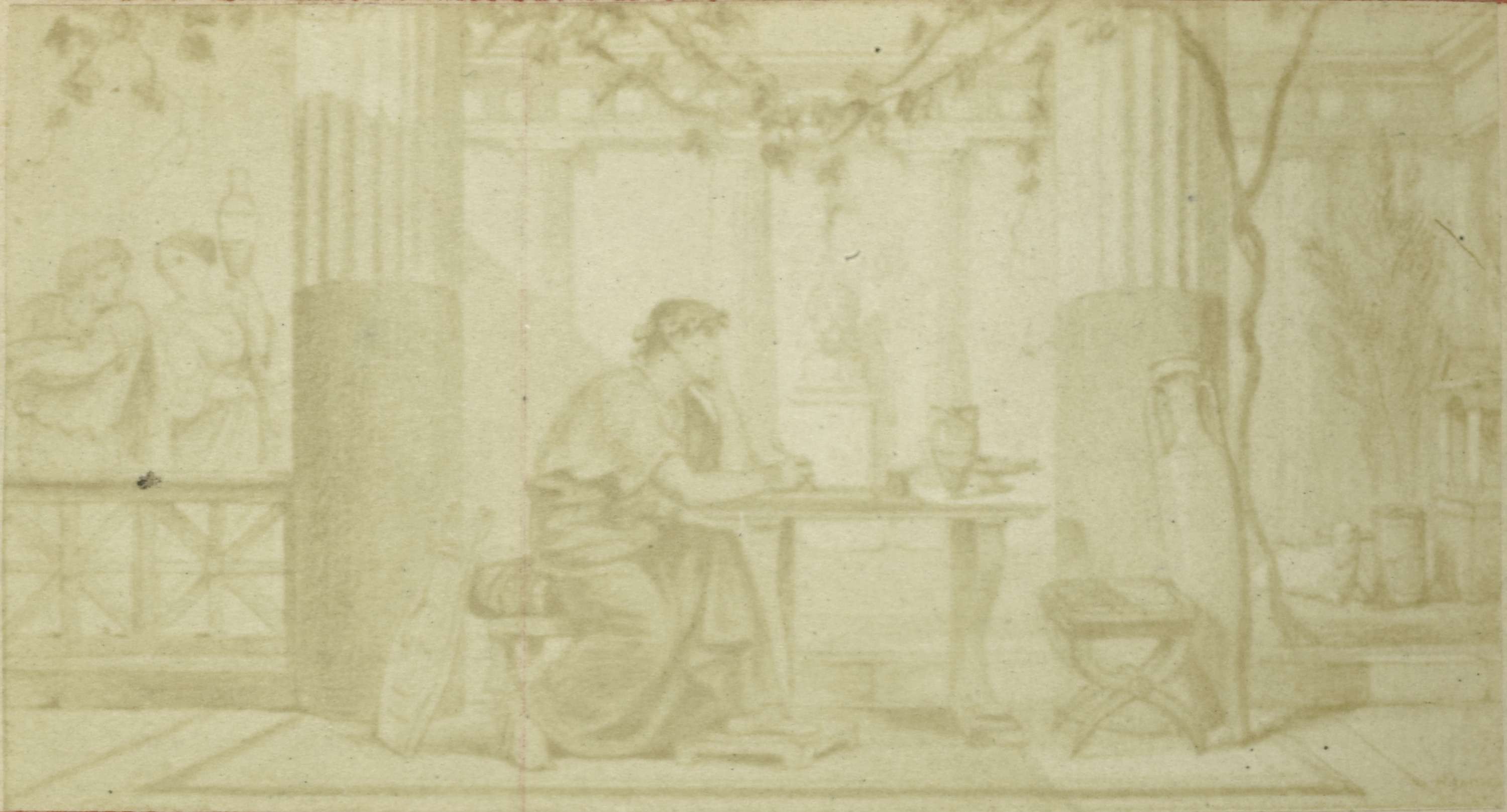 Fotoreproductie van een illustratie van een schrijvende man in een tuin