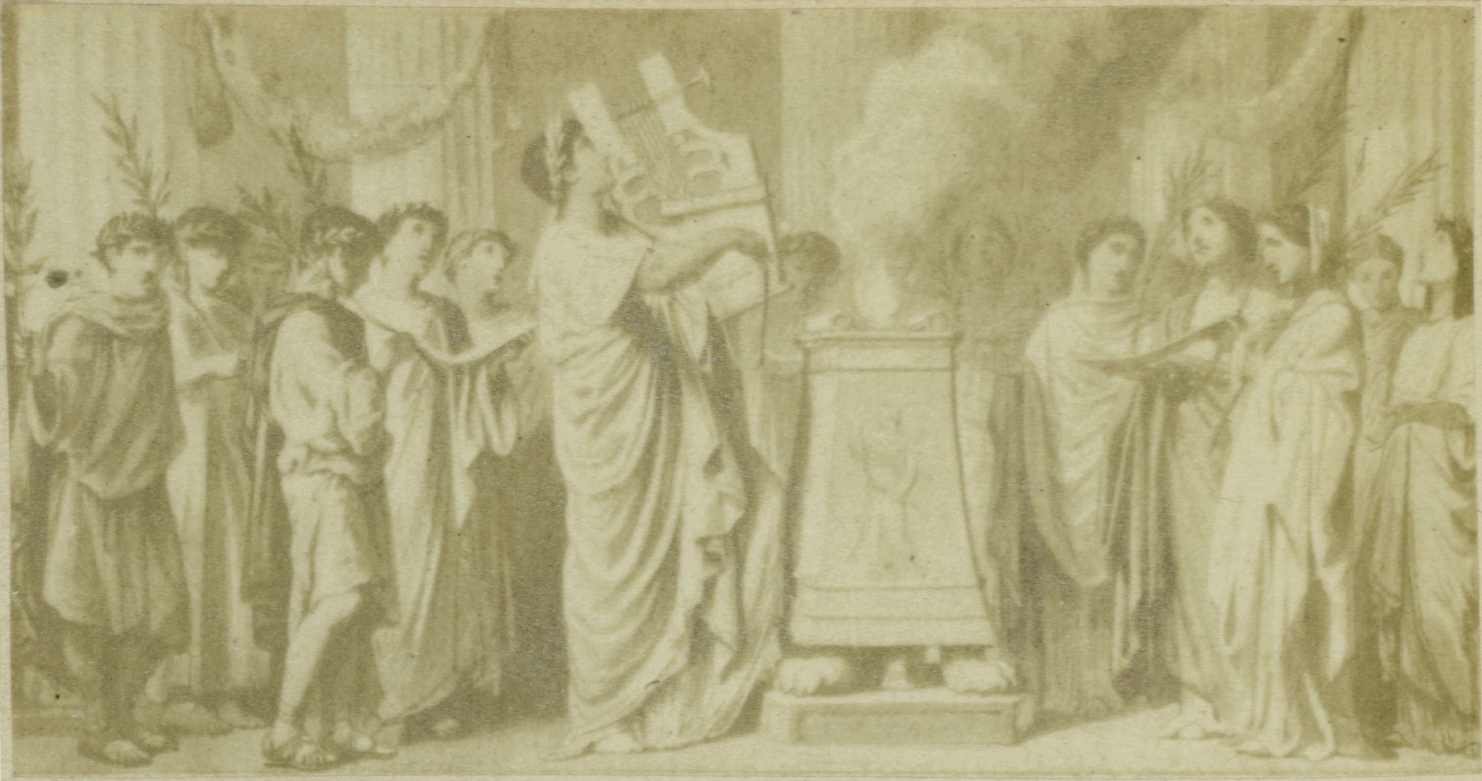 Fotoreproductie van een illustratie van zangers bij een tempel
