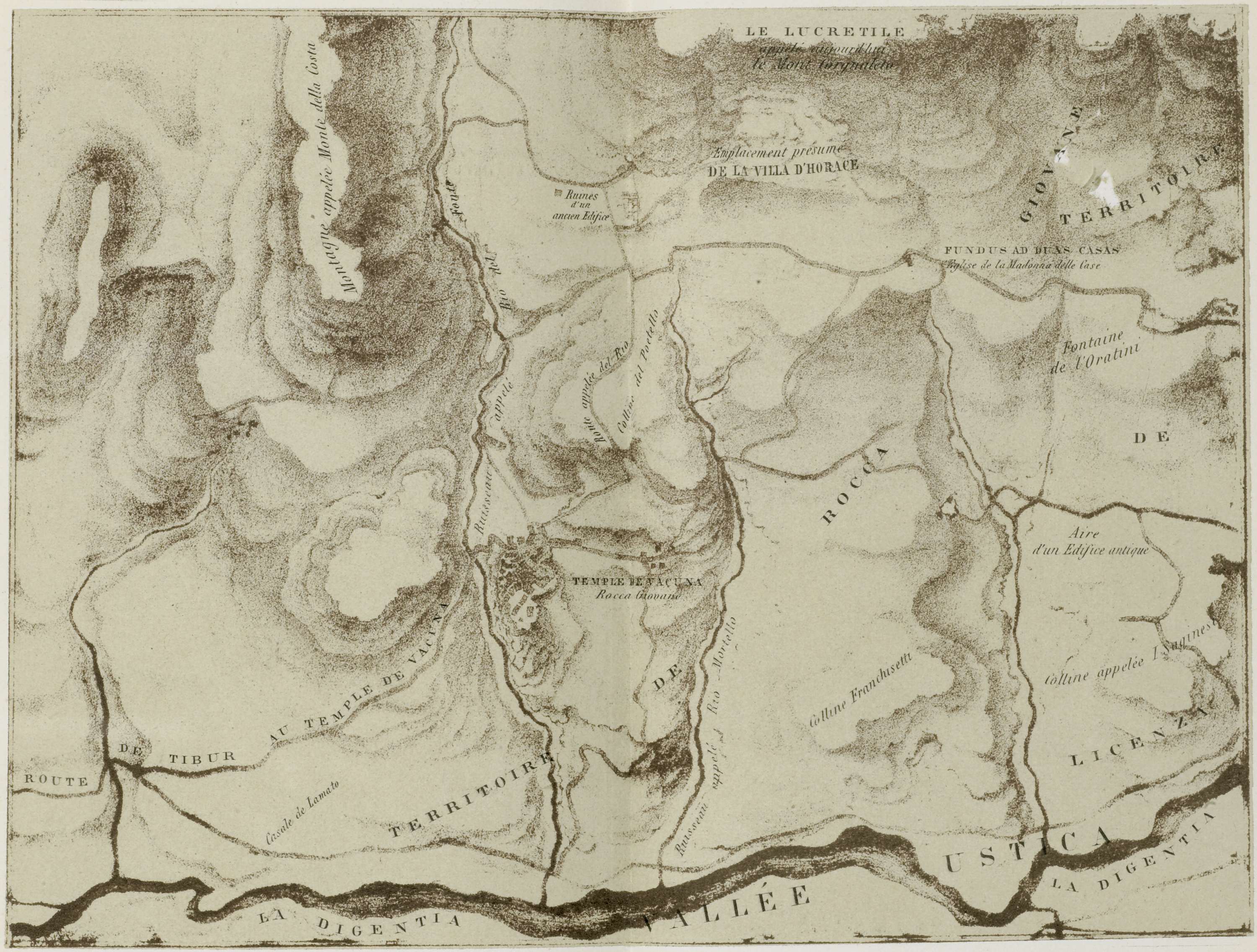 Kaart van de villa van Horatius met omgeving, in de regio van Roccagiovine