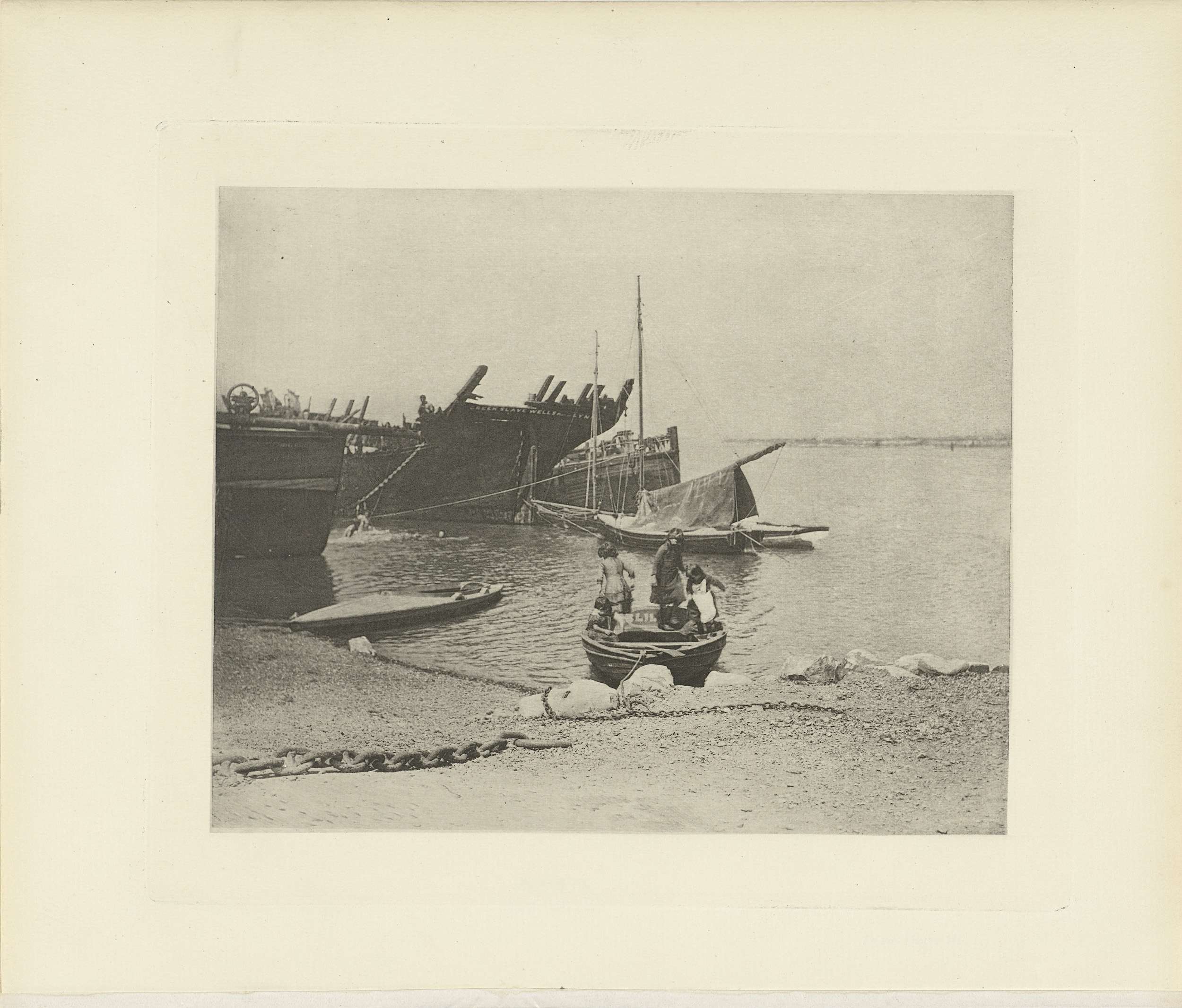 Gezicht op enkele onttakelde schepen en een boot met drie kinderen aan een kust in Groot-Brittannië