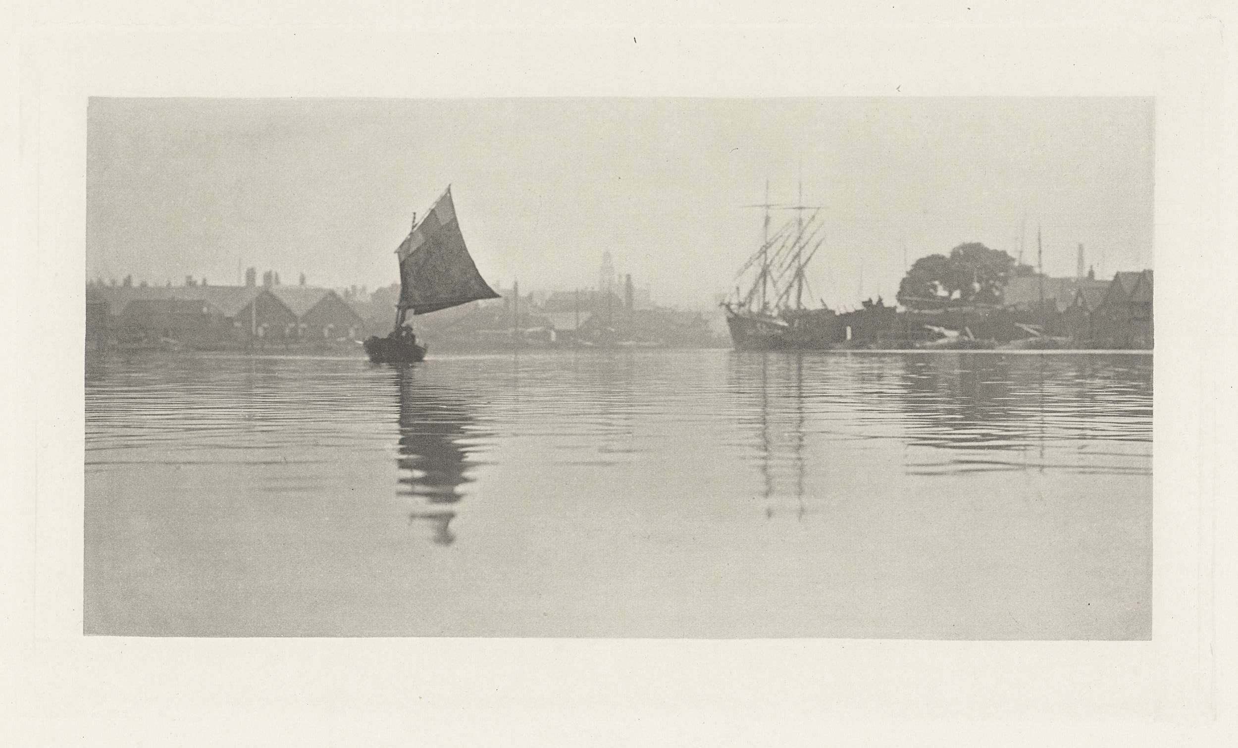 Gezicht op een stad aan de kust van Groot-Brittannië, vooraan enkele schepen