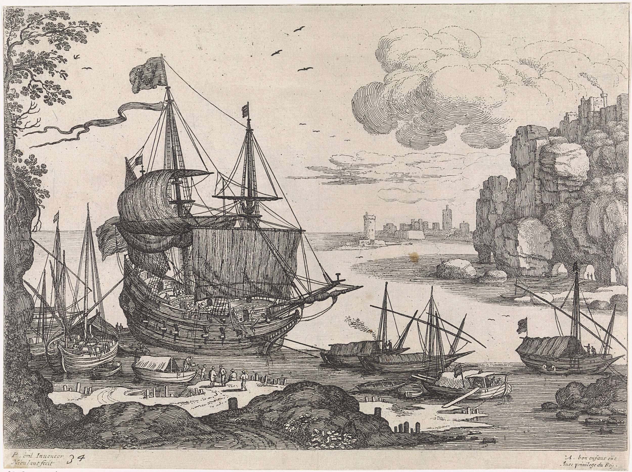 In een haven liggen verschillende zeilschepen en één groot zeilschip, dat een vlag voert met drie Franse lelies. Prent uit een serie Italiaanse landschappen.