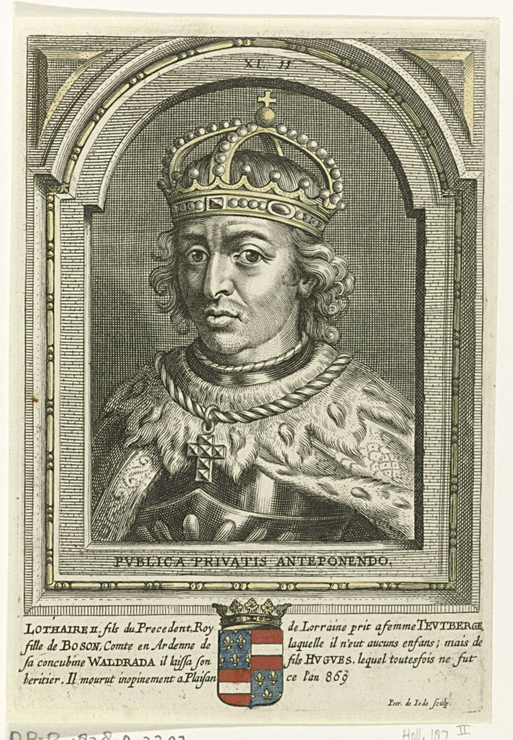 Busteportret van Lotharius II, met kroon. Hij draagt een mantel en een ketting met hanger van een kruis. Het portret is gevat in een boogvormige omlijsting met vierkant randwerk en een motto in het Latijn. In de marge het wapenschild van de geportretteerde en een vierregelig onderschrift in het Frans. Prent uit een boek waarin ...