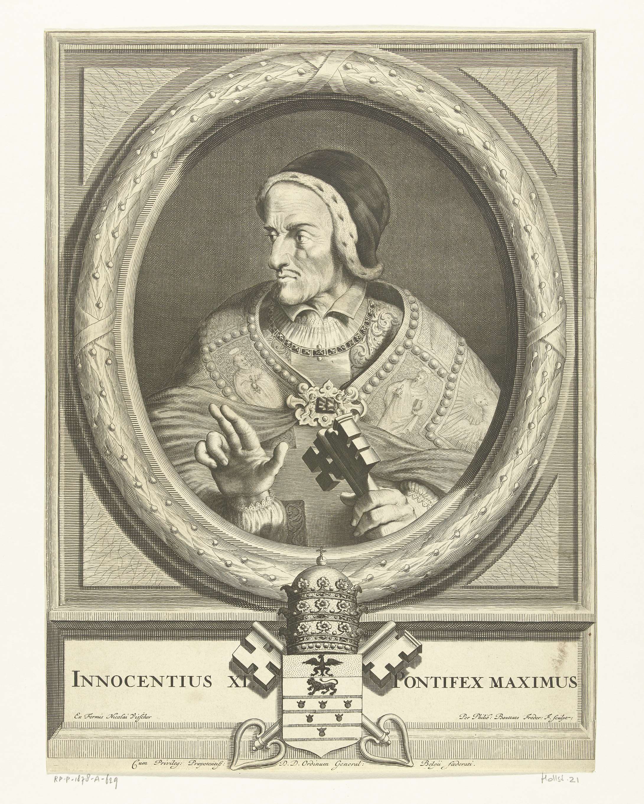 Portret in ovale lijst van paus Innocentius XI. Buste naar links. Hij draagt het pauselijk gewaad en op het hoofd een mutsje (kalot) afgezet met hermelijn. In zijn linkerhand houdt hij de pauselijke sleutels vast. Middenonder het pauselijk wapen.