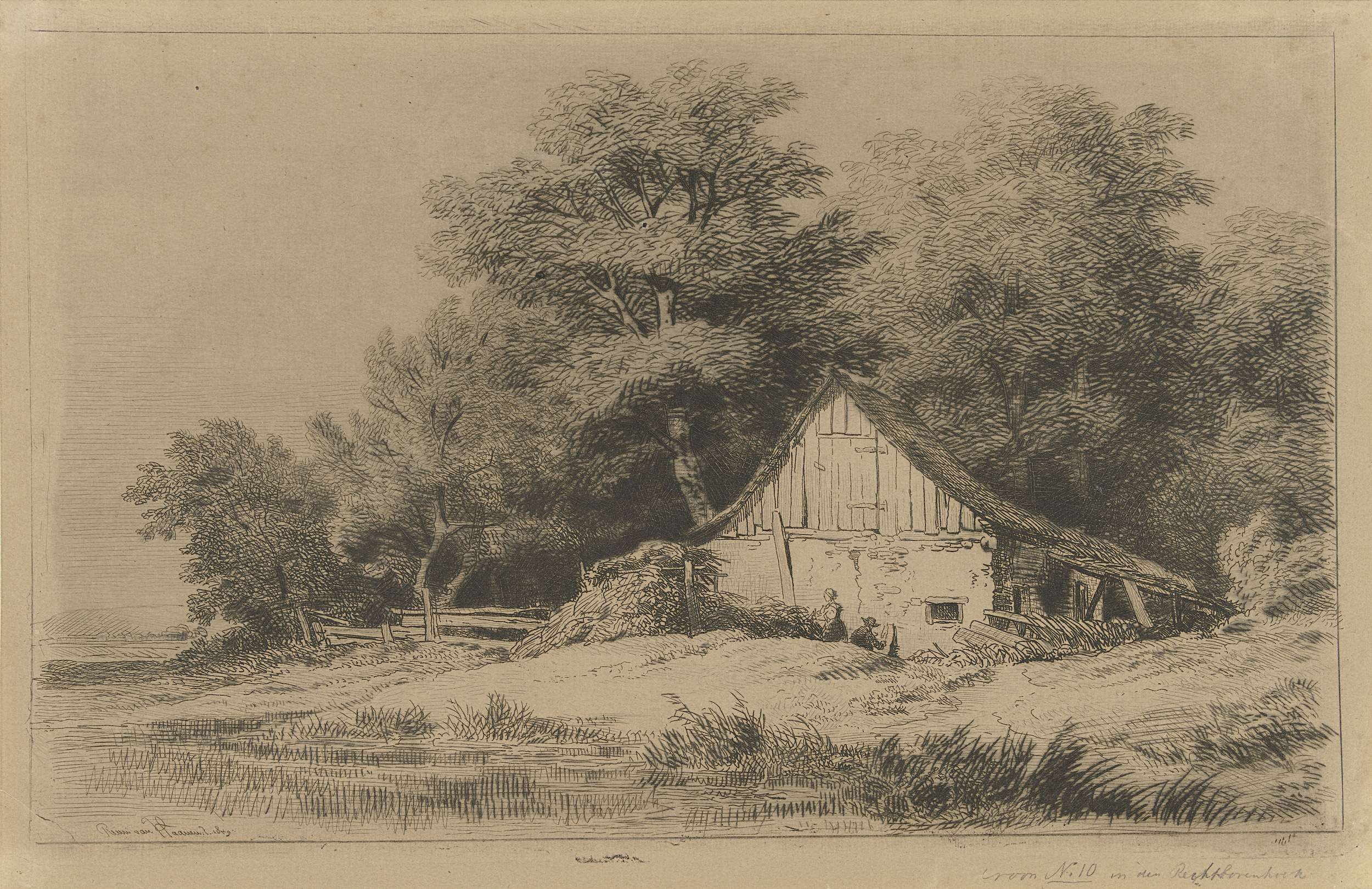 Een schuur met twee figuren en een bomenrij aan het water.