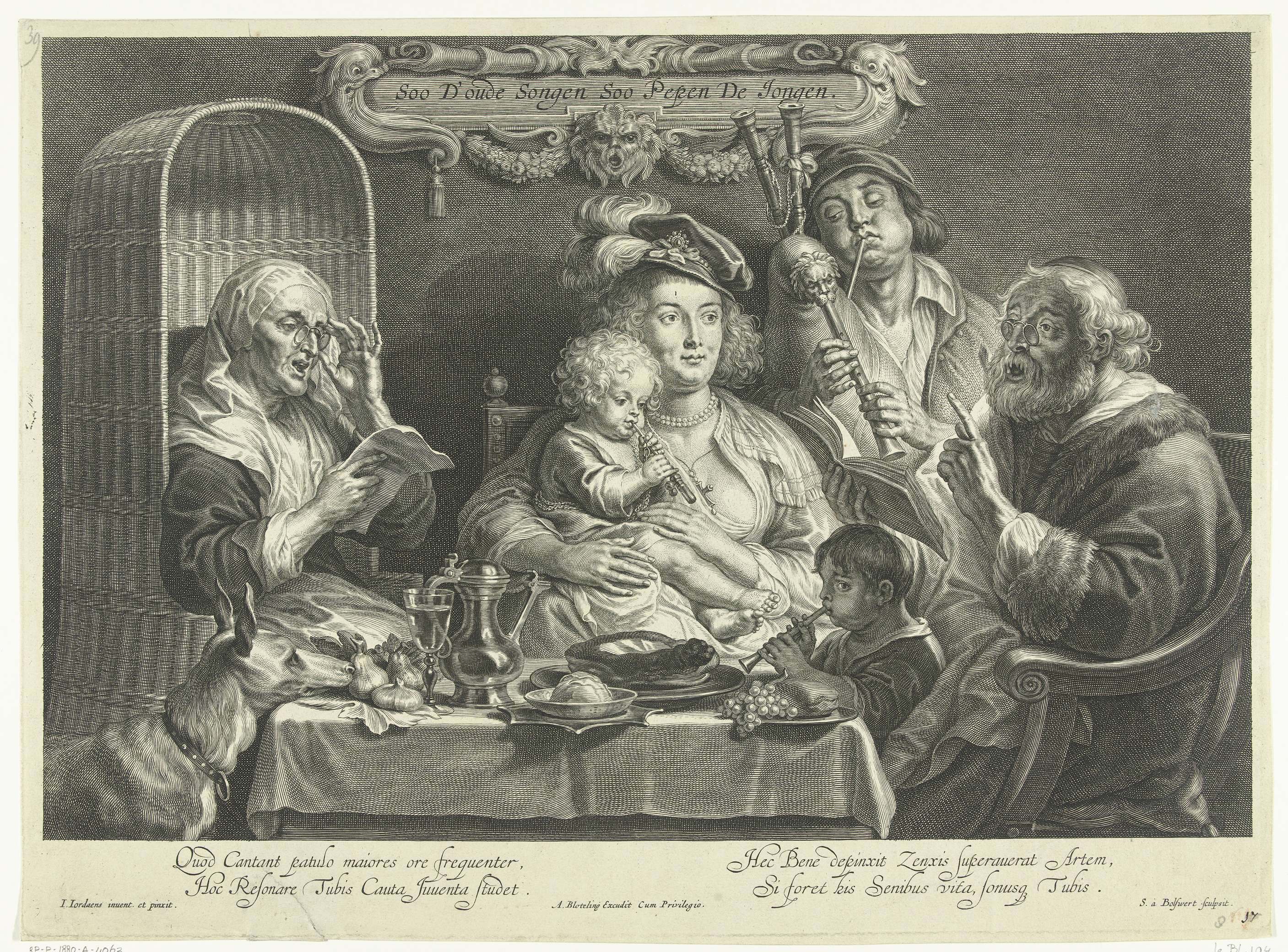 Een moeder zit met een klein kind dat fluit speelt op haar schoot aan een gedekte tafel. Naast haar blaast haar echtgenoot met bolle wangen op een doedelzak en een kleine jongen speelt op een fluit terwijl zijn grootvader en grootmoeder, beiden met bril, zingen. De zingende oude man geeft met een vinger de maat ...