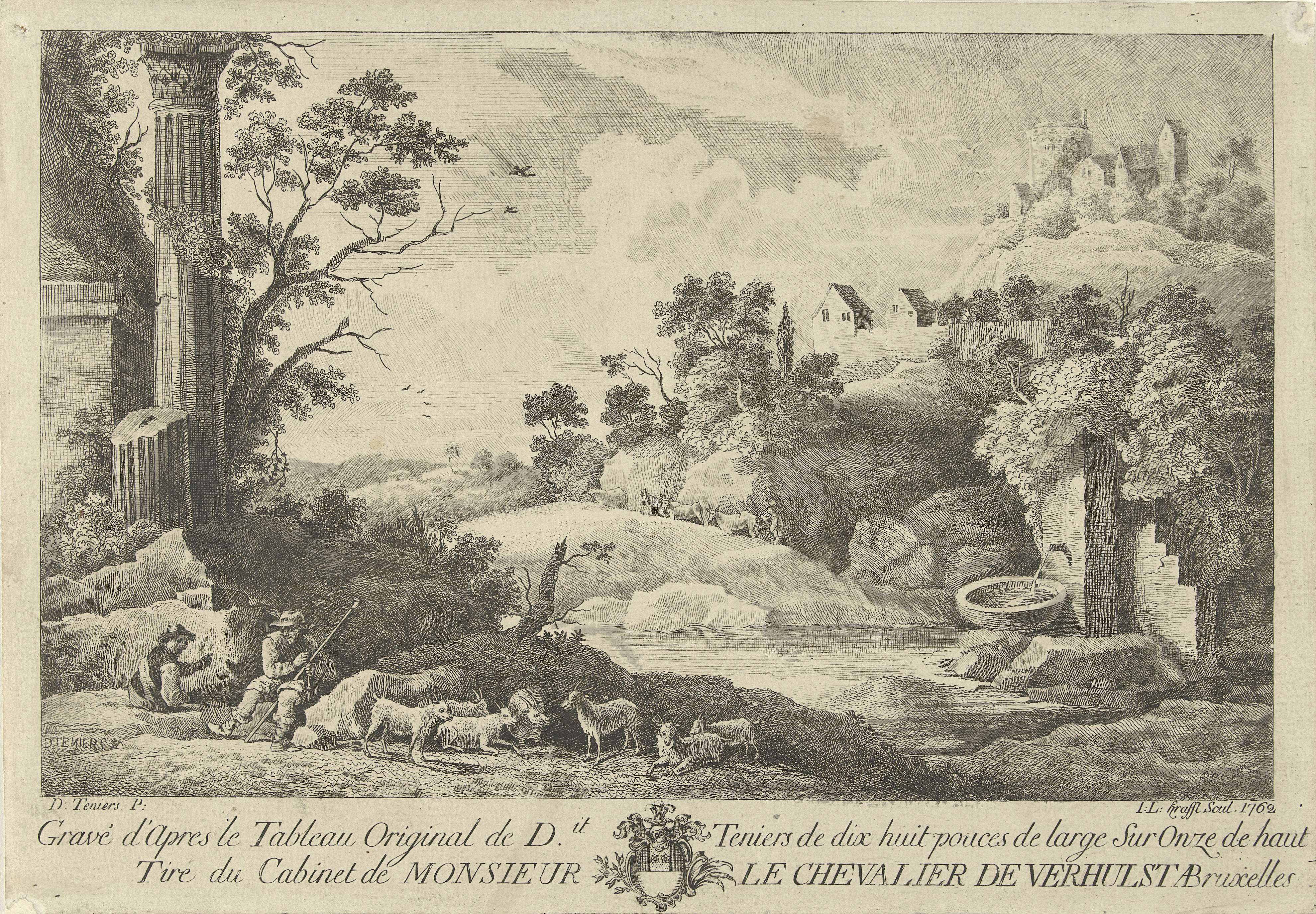 Heuvelachtig landschap met een ruïne en een fontein. Links op de voorgrond zitten twee herders met hun geiten. Op de achtergrond drijft een herder zijn runderen over een heuvel. Onder de afbeelding twee regels tekst en een familiewapen.