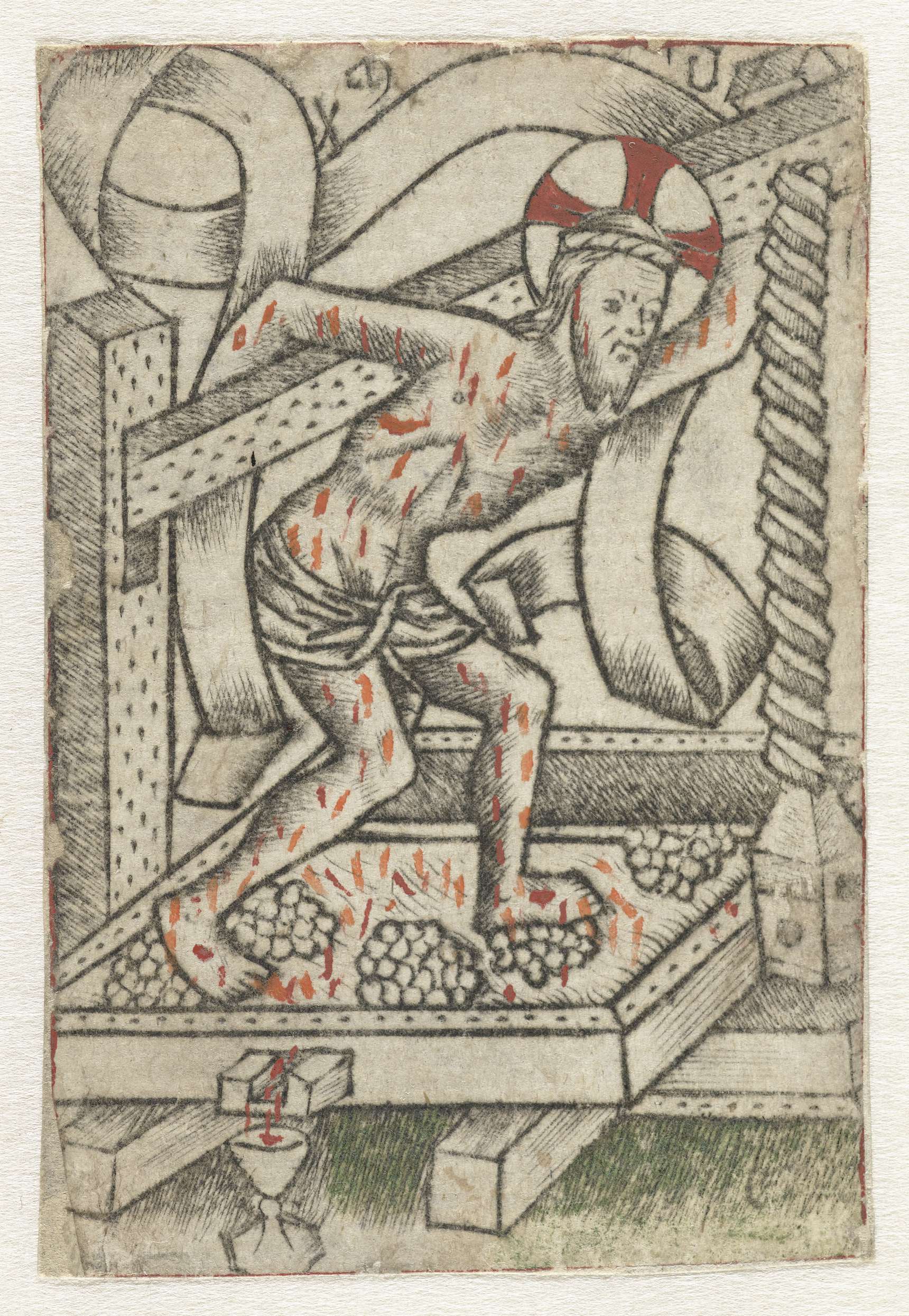 Christus staand op de druiven in de wijnpers, een deel van de pers op zijn rug dragend. Het bloed stroomt uit de pers in een miskelk. Een banderol zonder opschrift omgeeft de figuur van de Christus.
