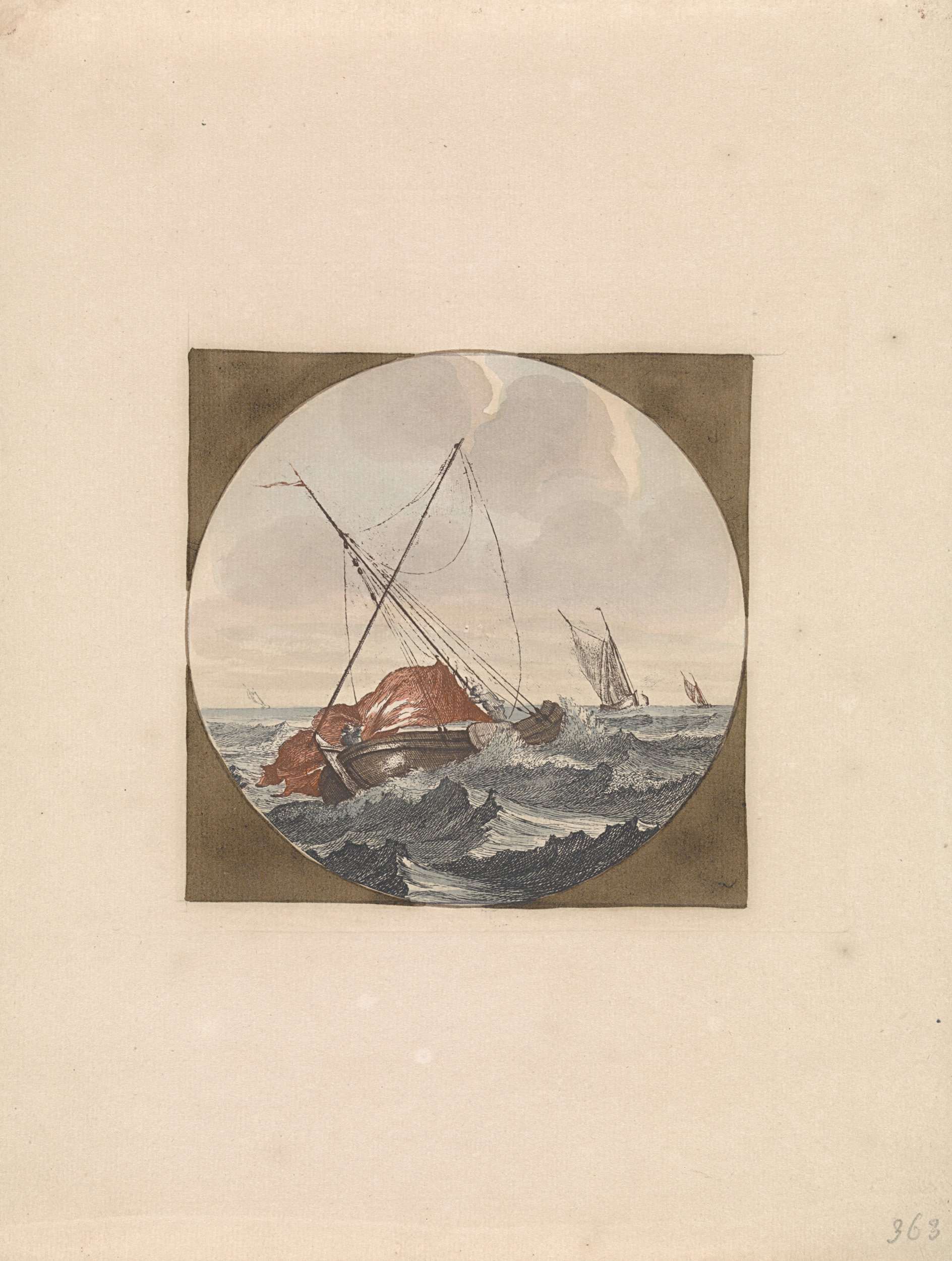 Twee mannen strijken het zeil van een platbodem. Op de achtergrond andere zeilschepen.