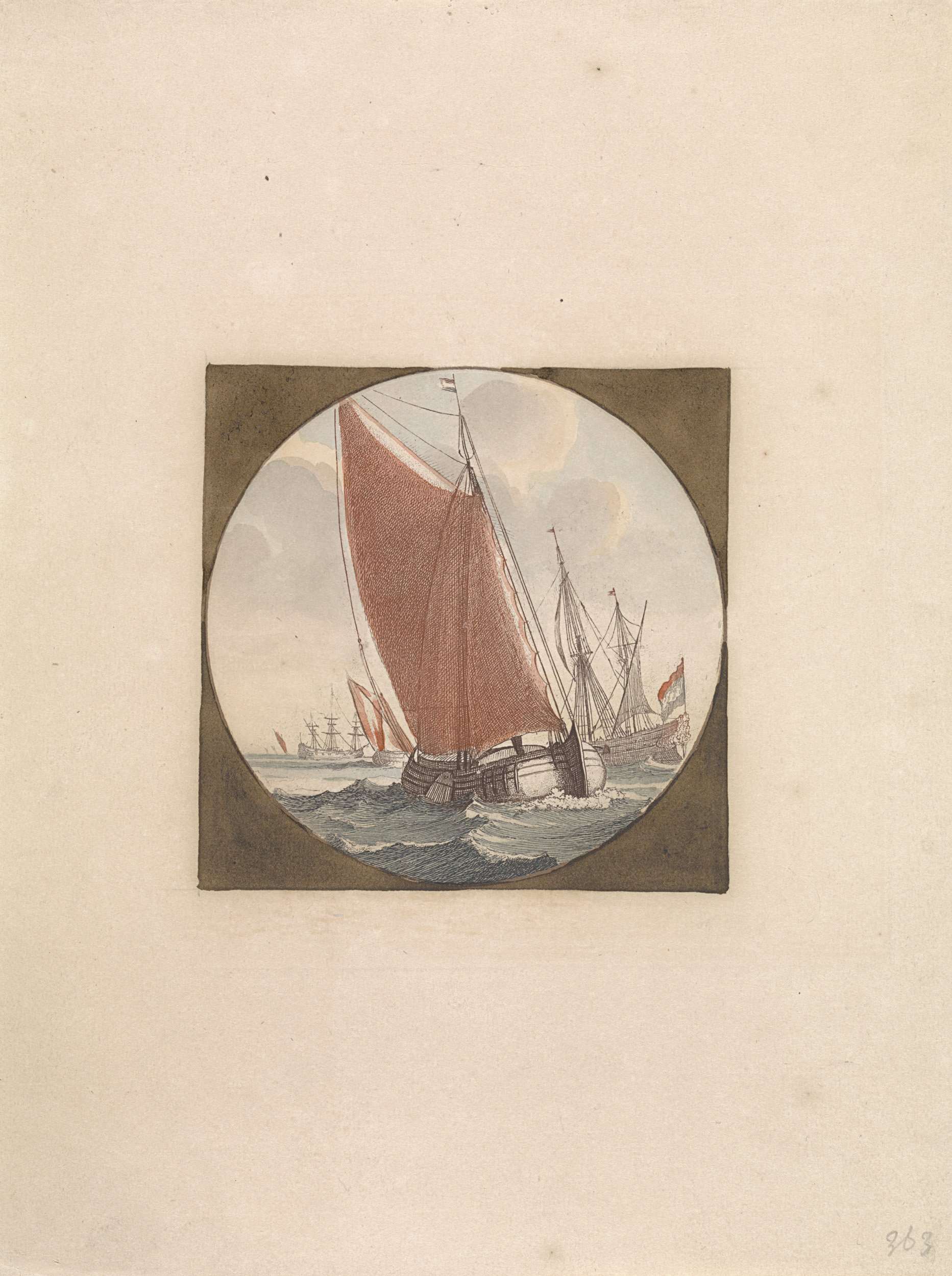 Een platbodem vaart met volle roodbruine zeilen, het rechterzijzwaard neergelaten. Op de achtergrond een zeilschip met de Nederlandse vlag.