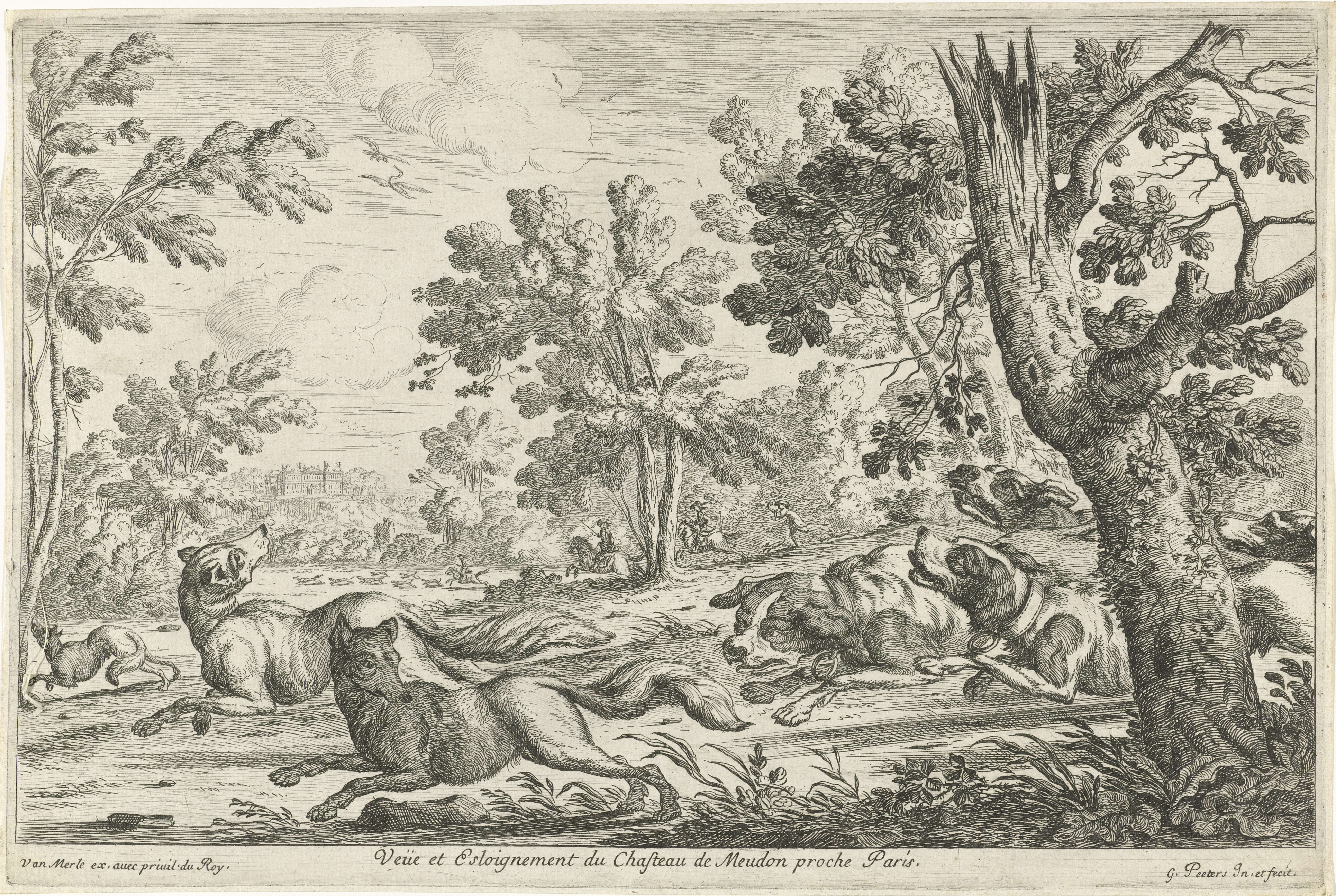 Landschap met een vossenjacht. Links op de achtergrond een gezicht op Château de Meudon, nabij Parijs. In de marge een onderschrift in het Frans.