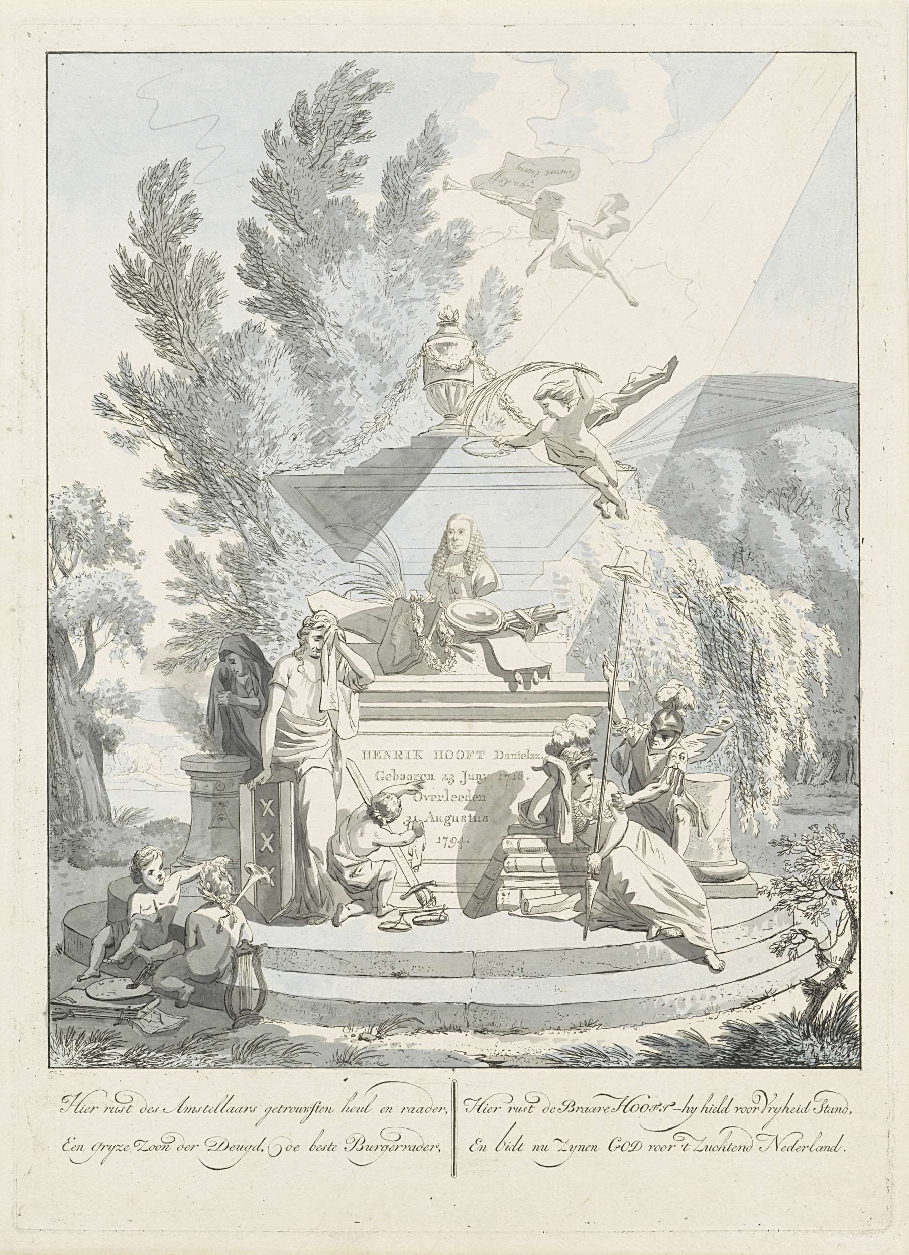 Allegorisch grafmonument voor Hendrik Danielsz. Hooft, oud-burgemeester van Amsterdam, overleden op 31 augustus 1794. Voor het monument treuren Godsdienst, Amsterdam en de Vrijheid. Achter geboomte rechts het fronton van de tempel Paix. Met vierregelig vers.