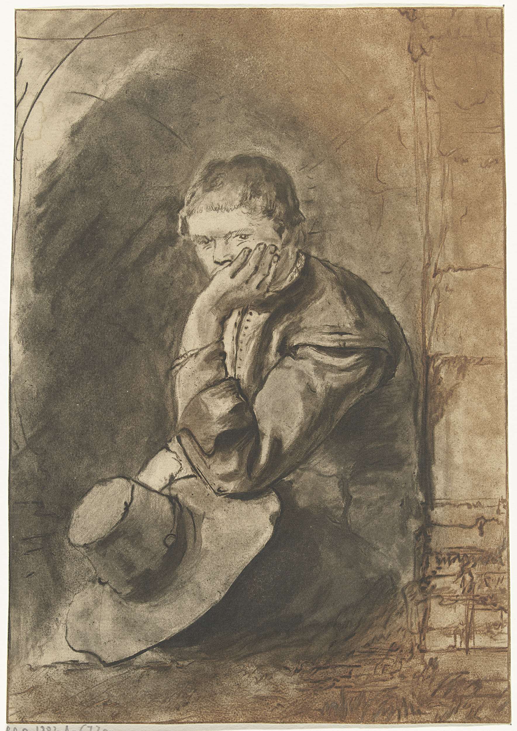 Een man zit in een nis. Met zijn ene hand ondersteunt hij zijn hoofd. In zijn andere hand houdt hij zijn hoed vast.