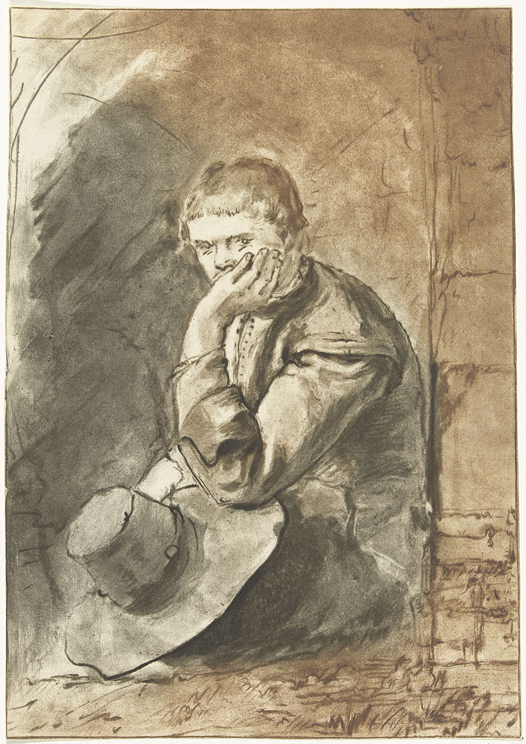 Een man zit in een nis. Met zijn ene hand ondersteunt hij zijn hoofd. In zijn andere hand houdt hij zijn hoed vast.