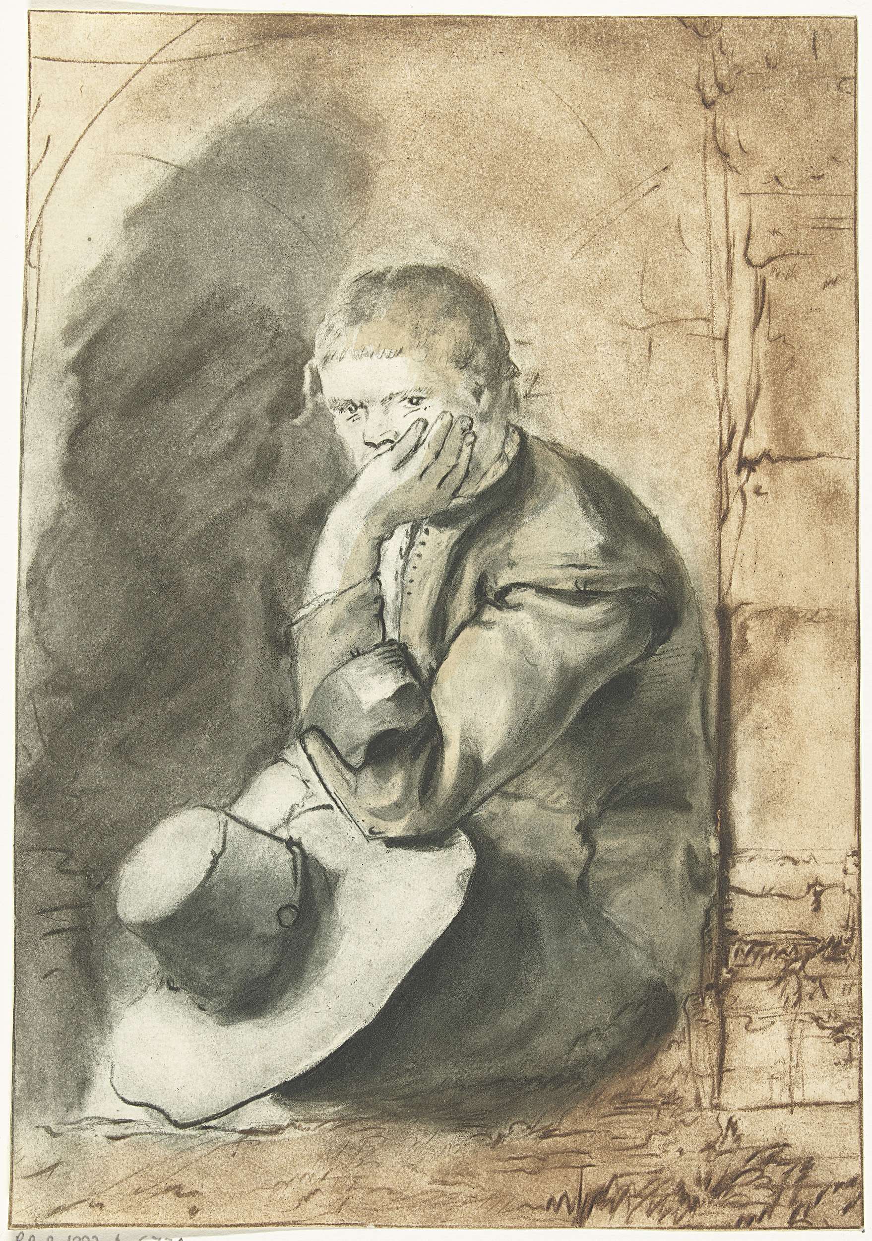 Een man zit in een nis. Met zijn ene hand ondersteunt hij zijn hoofd. In zijn andere hand houdt hij zijn hoed vast.