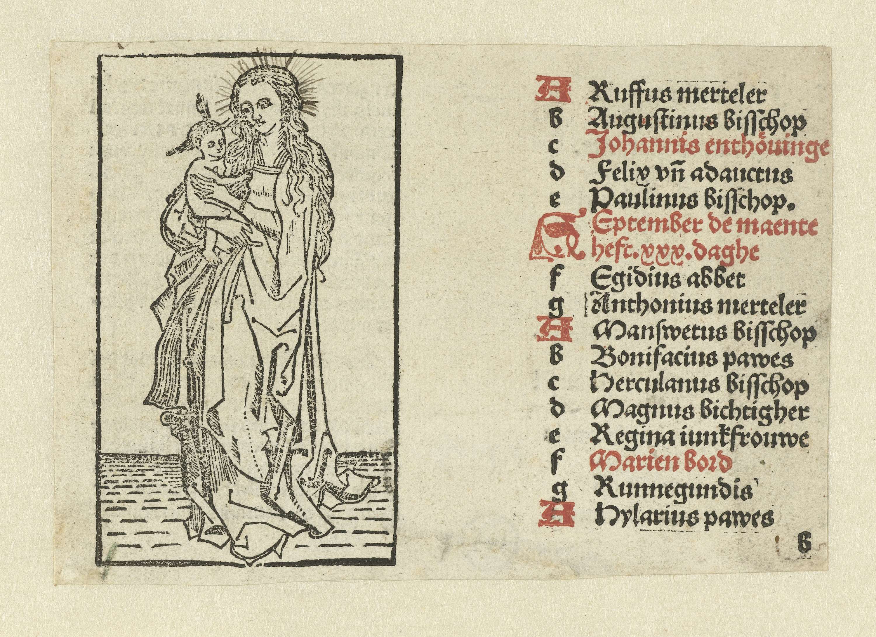 Blad uit een boek. Maria ten voeten uit, het kind op haar rechterarm. Met de hand getekende stralenkrans. Rechts naast de afbeeldingen een tekst in rood en zwart: Rufus merteler...Hylarius parves.