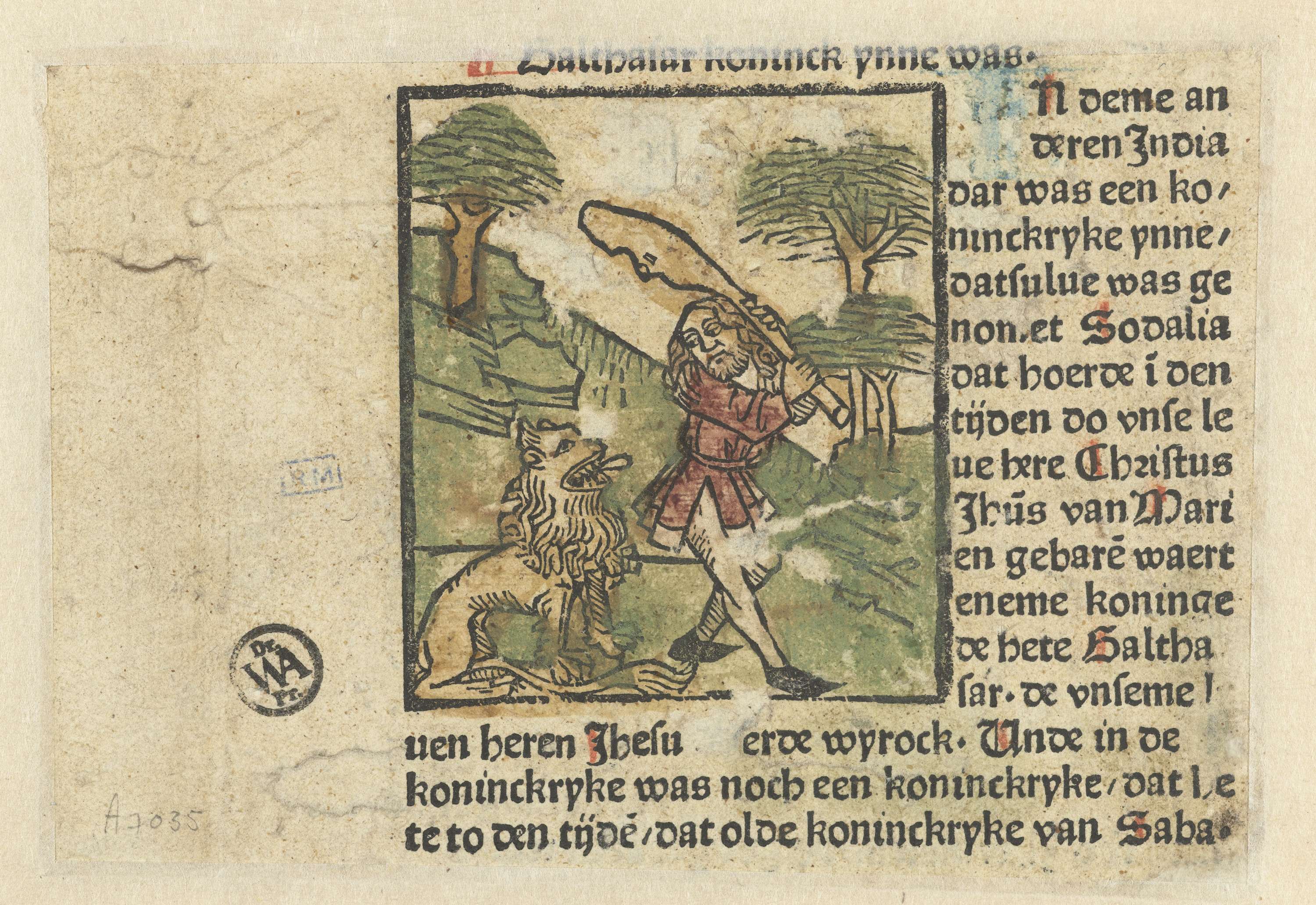 Blad uit een boek. Hercules met knots geheven naar zittende leeuw in landschap.
