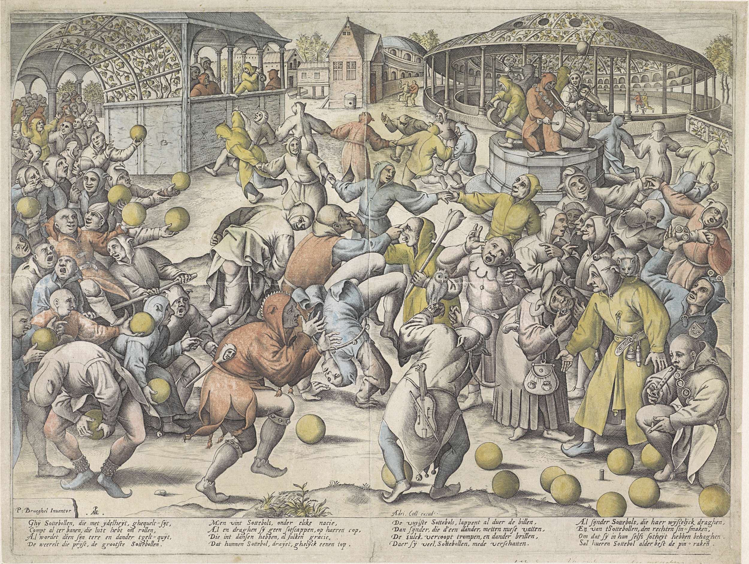 Een groot aantal narren dansen en springen, blazen op fluiten en mondtrommel of rollen met ballen over de grond. Op de voorgrond een nar die met een uil op de hand een obsceen gebaar maakt. Op de achtergrond rechts staan de muzikanten op een verhoging, links zitten enige toeschouwers in een prieel. Rechts in de ...
