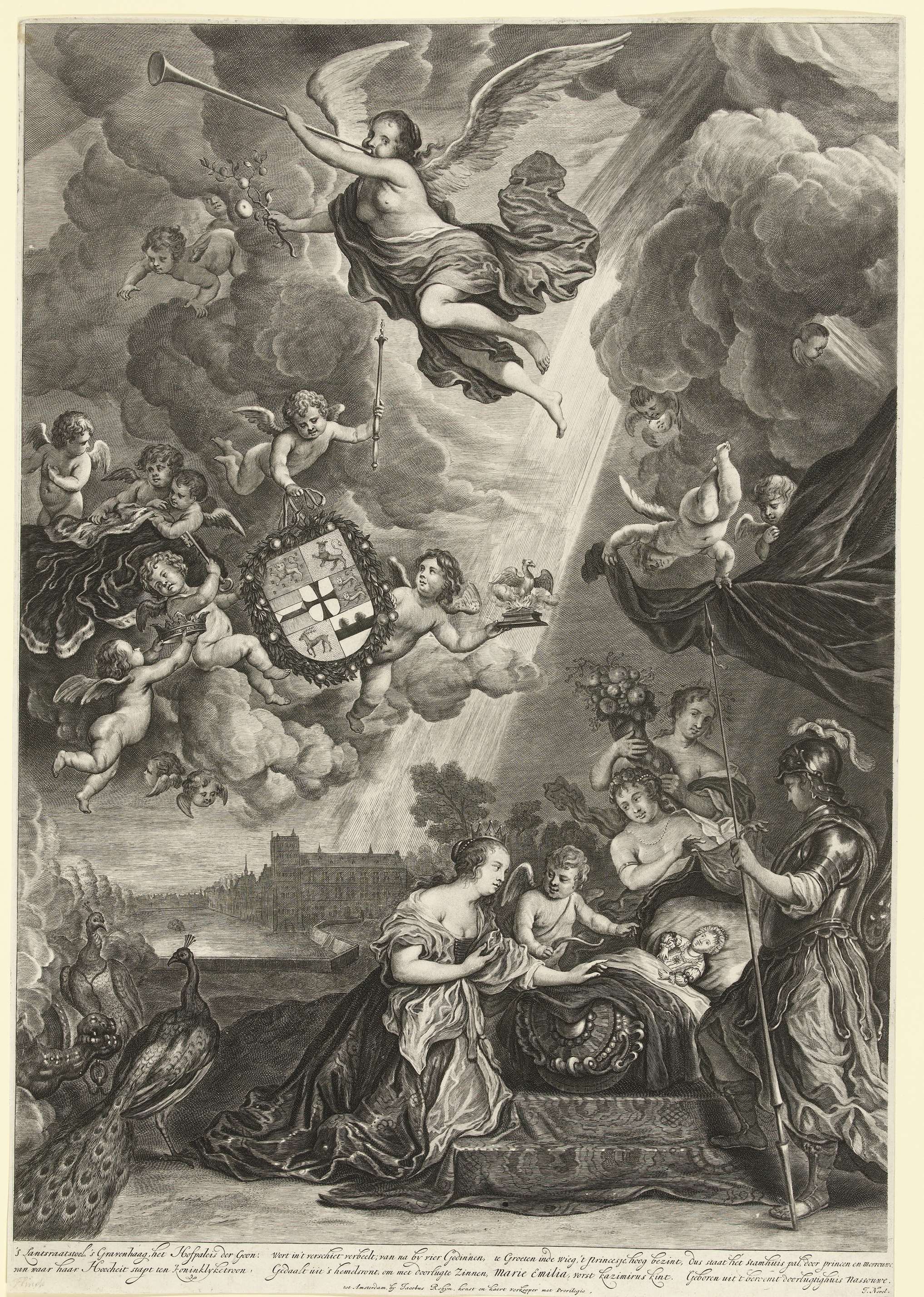 Allegorie op de geboorte van prinses Maria Amalia van Nassau-Dietz, dochter van Hendrik Casimir, 29 januari 1689. Om de wieg met het kind staan en knielen Minerva, Juno en Cupido en Flora. Links de pauwen van Juno. In het verschiet de Hofvijver en de gebouwen van het Binnenhof. In de lucht dragen engelen het wapen ...