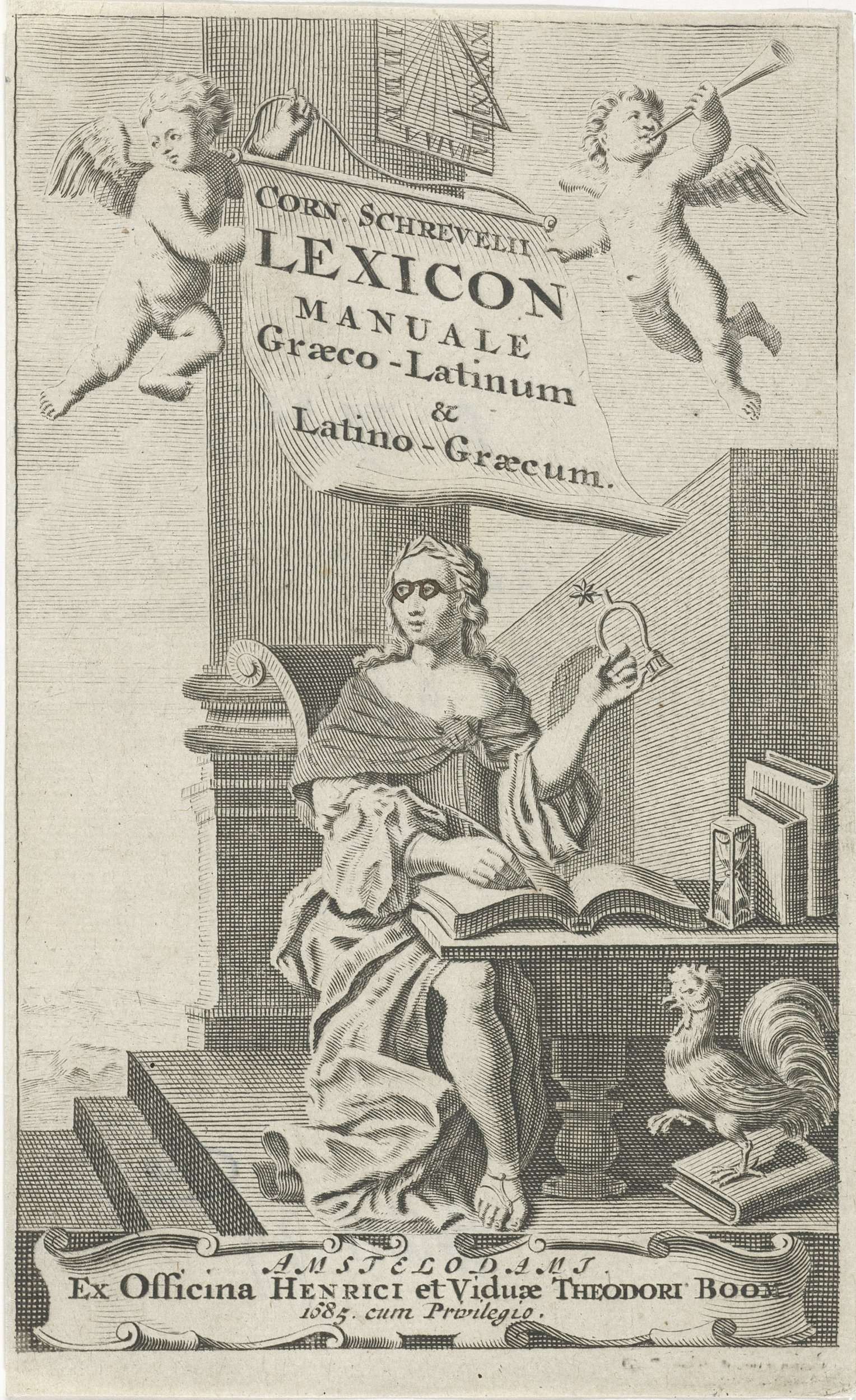 Een vrouw, in klassiek gewaad, zittend achter een schrijftafel, in de hand een spoor, als verwijzing naar de rede. Op de tafel een zandloper, als symbool voor vergankelijkheid Aan haar voeten een haan, als symbool voor waakzaamheid. Op de zuil achter haar een zonnewijzer, die verwijst naar het verstrijken van de tijd. Twee engelen houden ...