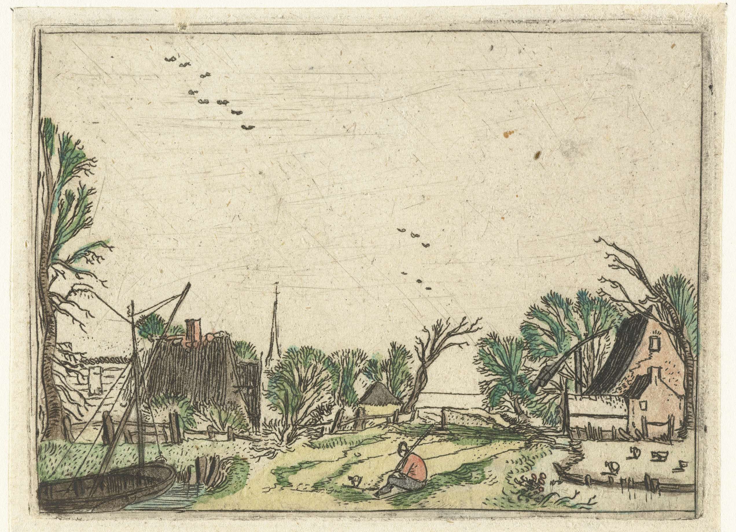Tweede prent uit een serie van zeven kleine landschappen. Aan de rand van een dorp met boerderijen zit een man met een stok in een weiland. Vlakbij hem ligt een zeilbootje. Het prentje werd later met de hand ingekleurd.